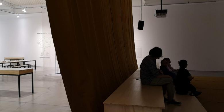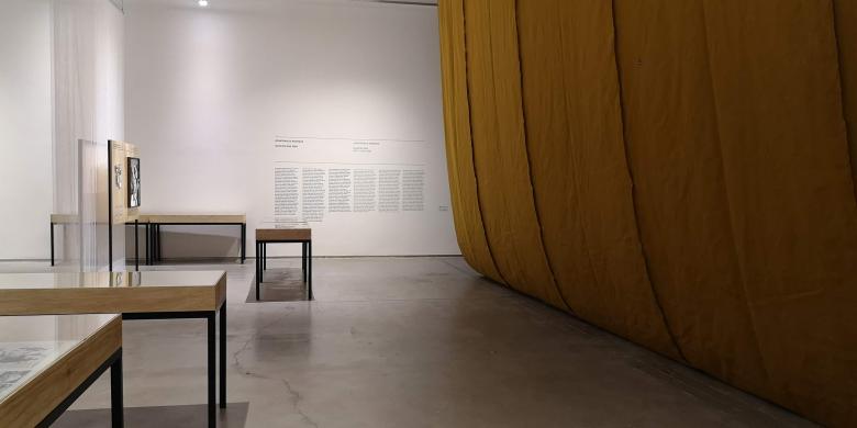 The curtain in the first projection room is wavy and houses the work “Fala da Terra”. The show continues with the many façade screens that serve to organize the two curatorial nuclei. They overlap in translucent layers, and the second and last projection room is gradually revealed as the visitor approaches the end of the route.