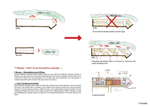 Seven scattered individual Office Glass Cubes not only define the different program spaces in between, but also allow the maximized natural light gain and urban landscape view to each corner of the office. Within such an arrangement, an inviting, open and transparent work atmosphere is created, representing the modern work style of the 21st century.