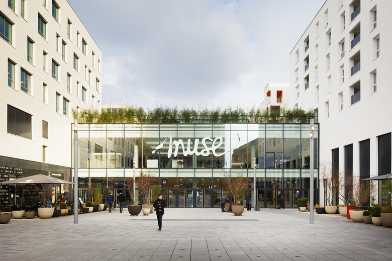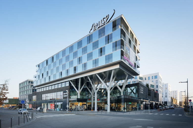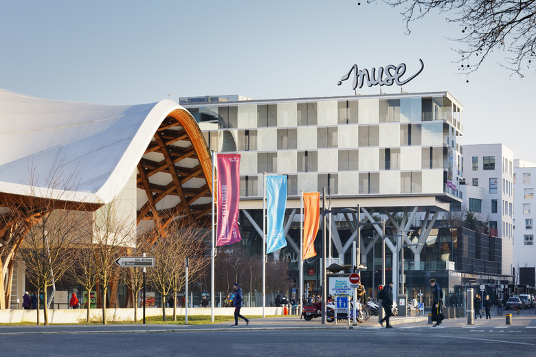 Topographically, Muse extends along a covered street that opens out opposite the Centre Pompidou-Metz. The housing block on this square, whose façade is clad in a checkerboard pattern of glass panels, rises up to invite the public to enter the shopping space with cafés, exhibition places, library, co-working spaces and restaurants.