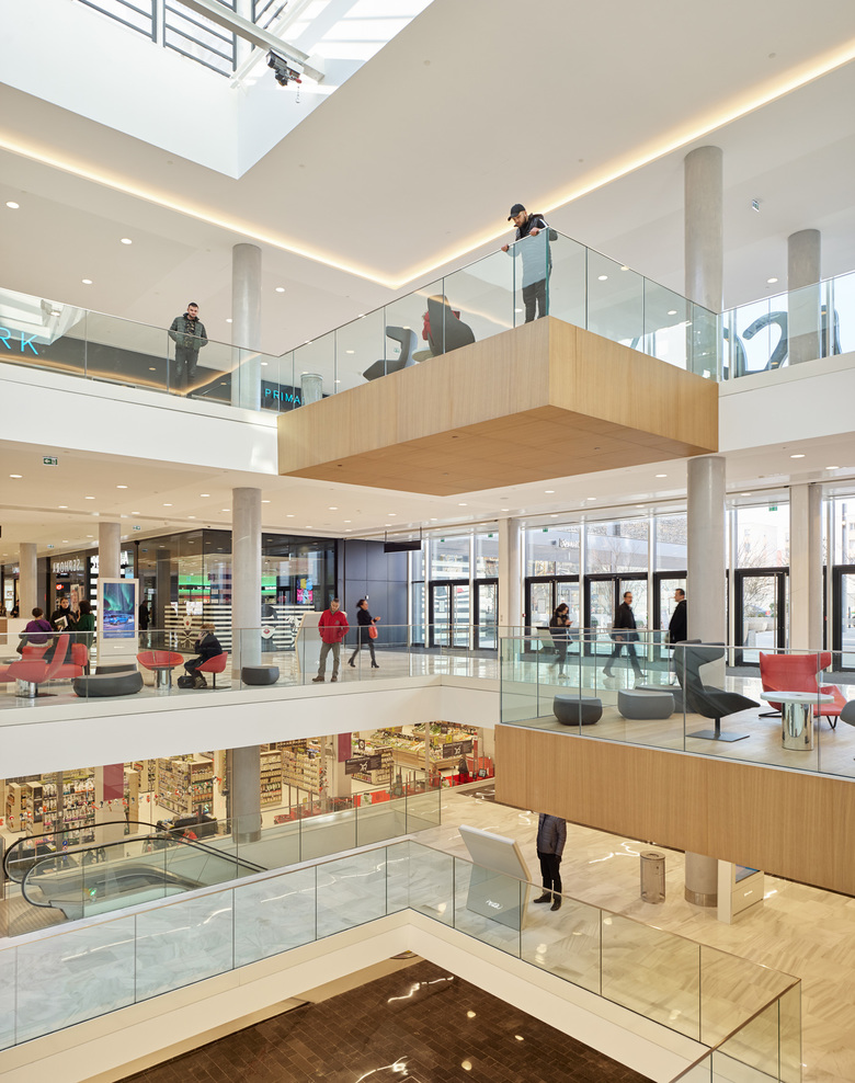 The route through Muse, pierced by light wells and glazed roofs, opens up onto two public squares offering relaxation areas and terraces.