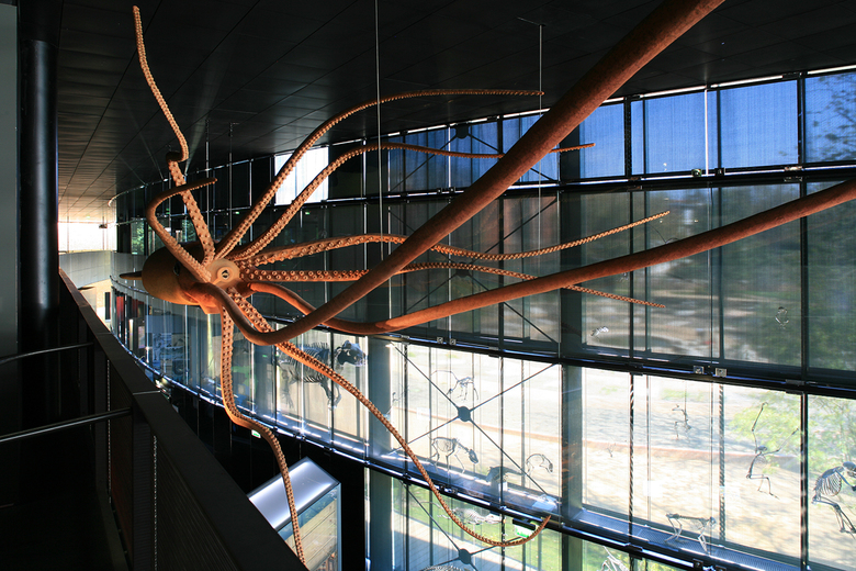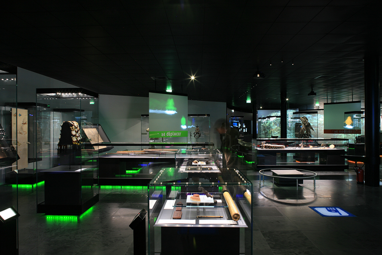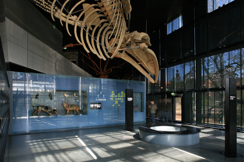 A large curved front of 120m in length showcases the façade of the new museum and it is the interactive link between the different elements and that affirms the unity of the composition. This façade is conceived on the principle of it being a “double skin” where the outer membrane acts as a filter that controls and diffuses light compared to inner skin that enacts as shelves storing historical minerals and skeletons creating different ambiance and atmospheres depending on the exhibition theme.These exhibitions are grouped on two large open planes, superimposed on the premises intended for conservation.