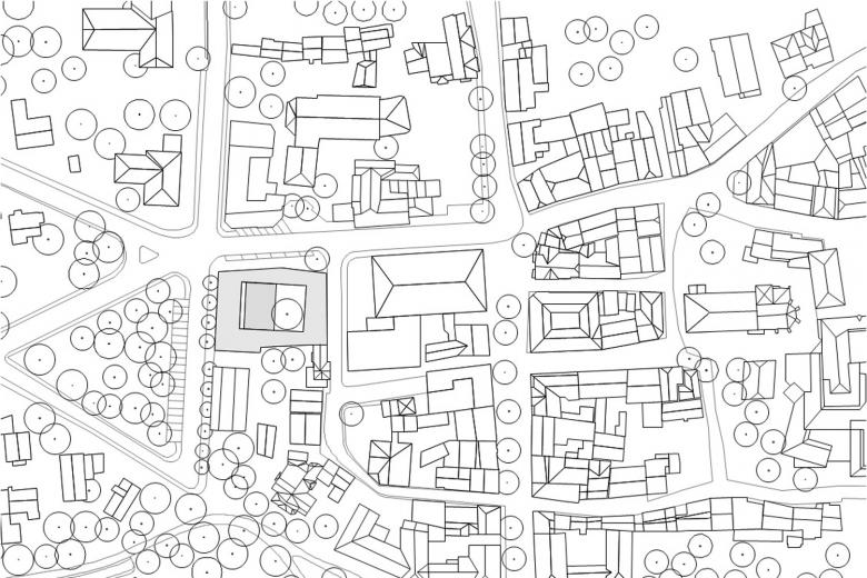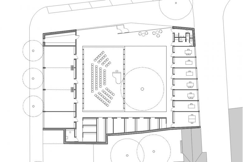 Der neue Gemeindesaal und ein Innenhof gleicher Größe bilden den Mittelpunkt, das ‚Herz’ des neuen evangelischen Gemeindezentrums der Petrusgemeinde. Damit wird auch räumlich dokumentiert, dass die Gemeinschaft im Mittelpunkt des Gemeindelebens steht. Ringförmig liegen alle Nutzungen des Gemeindezentrums um diese neue Mitte, die so zentrales, ordnendes Element ist.