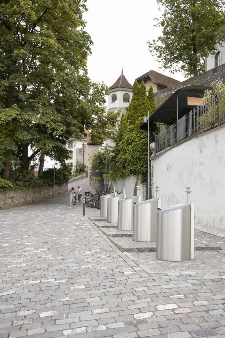 Der Schlossbergplatz nimmt eine wichtige städtebauliche Situation ein. Er ist als Zugang zu Schloss und Altstadt trotz der geringen physischen Grösse ein bedeutender Ort. Bis zur Eröffnung des Schlossbergparkings wurde der Platz grösstenteils für die Parkierung genutzt. Die verschiedenen Nutzungen zeugten von einer verkehrstechnisch hohen Belastung des kleinen Schlossbergplatzes. Neu erhält der Platz eine einheitlich ungebundene ortstypische Reihenpflästerung aus Naturstein. Zentrales Element des Platzes stellt die mittig des Platzes angeordnete identitätsstiftende Baumpflanzung dar. Die den Platz flankierenden Mauern werden visuell freigespielt, der bestehende Fahrradunterstand entfernt. Eine neue Beleuchtung soll sich nach dem Beleuchtungskonzept Schlossberg richten und auf tiefem Helligkeitsniveau betrieben werden. Mit der reduzierten Ausgestaltung auf dem Platz wird ein sehr tiefes Geschwindigkeitsniveau des MiV angestrebt, wodurch die Koexistenz zum Langsamverkehr und damit ein Mischverkehrsregime ohne bauliche Führungselemente auf dem Platz ermöglicht wird. Die ebenfalls neue Unterflursammelstelle wird entlang der bestehenden Schlossmauer aufgereiht.