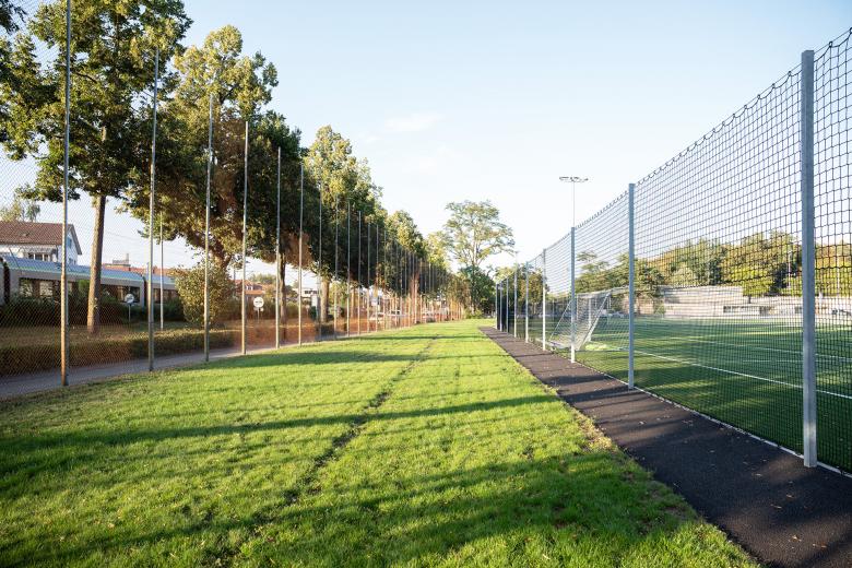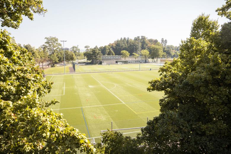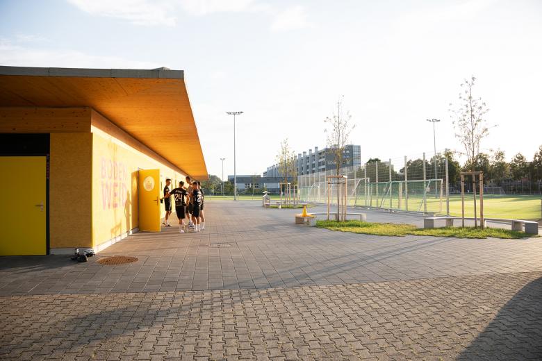 Die Erneuerung der bestehenden Garderobenanlagen auf dem Sportplatz Bodenweid erfolgt mit zwei schlanken, eingeschossigen Volumen. Diese haben jeweils eine geöffnete Frontseite und eine geschlossene Rückseite. Sie sind gespiegelt angeordnet, so dass zwischen den beiden ein Dialog entsteht. Zwischen den projektierten Kunstrasenfeldern entsteht im Herzen der Anlage ein grosszügiger Platz. Heller Mergelbelag hebt sich von den umgebenden Asphaltwegen ab. Scheinbar zufällig verteilte Dreiergruppen hochstämmiger Bäume, brechen die sonstige Strenge der langen, geradlinigen Elemente im Areal. Die Bäume spenden wohltuenden Schatten und bringen eine neue Aufenthaltsqualität. Der zentrale Platz dient zudem der Verteilung der Besucherströme und dient durch ungehinderte Sicht in alle Richtungen einer optimalen Orientierung auf dem Areal. Die Aussenraumgestaltung ermöglicht eine vielseitige, differenzierte Nutzung. Mit der klaren Abgrenzung im Zugangsbereich und der gelungenen Einbettung in die Umgebung erhält das Projekt einen indentitätsstiftenden, campusartigen Ausdruck.