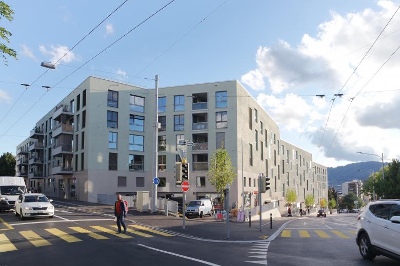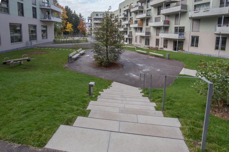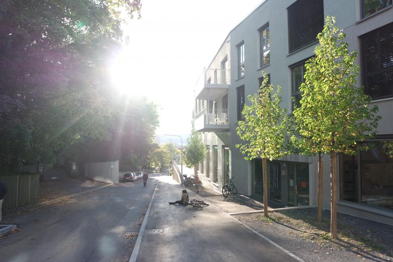 Die Bauvolumen in ihrer unterschiedlichen Geschossigkeiten sind der Hanglage entsprechend definiert, damit sich das Erdgeschoss treppenartig vom Niveau der Umgebung loslöst und spannende Vorbereiche entstehen. Der dadurch entstehende Sockelbereich schafft die gewünschte Privatheit der Wohnungen im Erdgeschoss. Das gewachsene Terrain bleibt im Hofbereich erhalten. Kleine Geländemauern schaffen Grün- und Aufenthaltsflächen, die als leicht aufstehende Geländescholle ausgebildet sind. Durch das Anheben der Grünflächen entstehen Aufenthaltsbereiche mit geringem Gefälle, die auch sehr selbstverständlich den geforderten exklusiven Nutzungen von Kindergarten und Kinderkrippe zugeteilt werden können. Nebst der repräsentativen Terrassenfläche beim Restaurant wird ein attraktiver Siedlungsplatz geschaffen, der in Kombination mit dem Gemeinschaftsraum seiner Funktion gerecht wird.