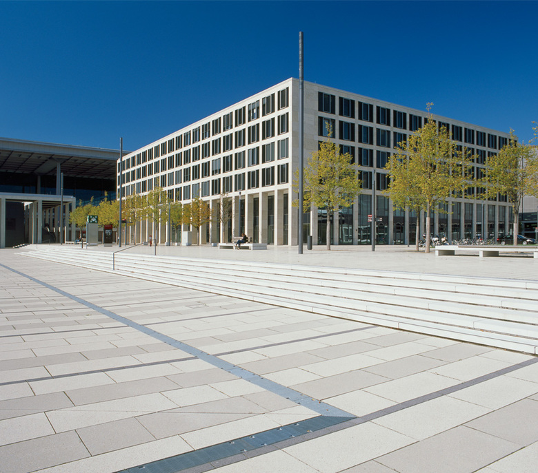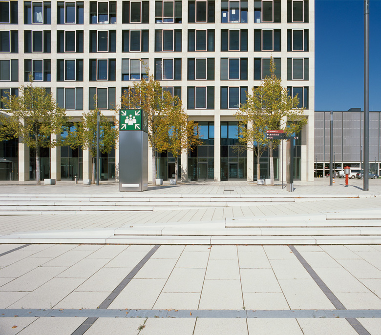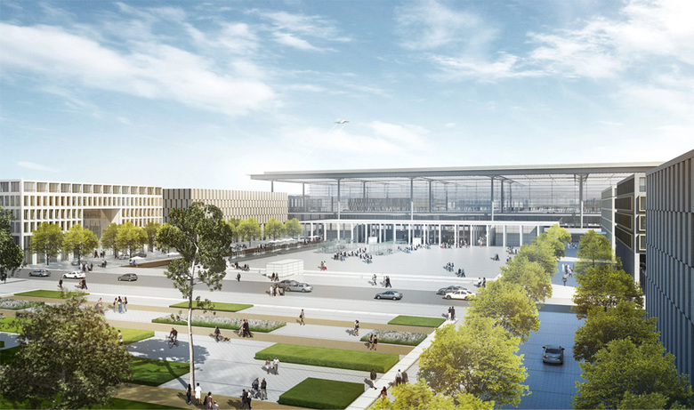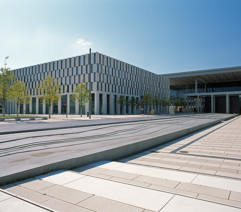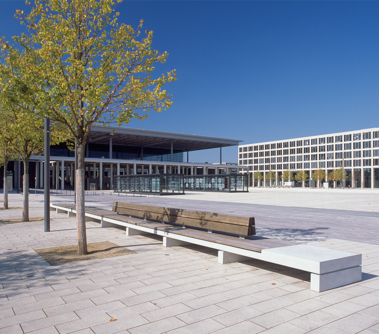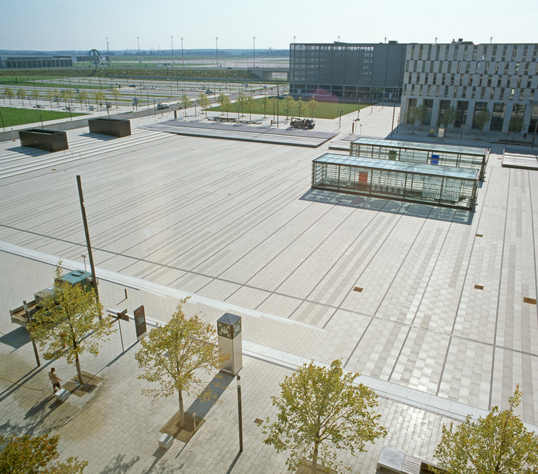 Der Willy-Brandt-Platz ist das Zentrum des urbanen Raumes der Airport-City und liegt als steinerner städtischer Platz als Entree vor dem Terminal.