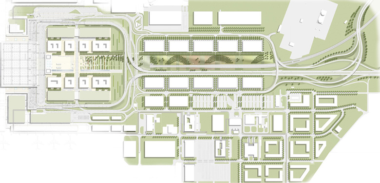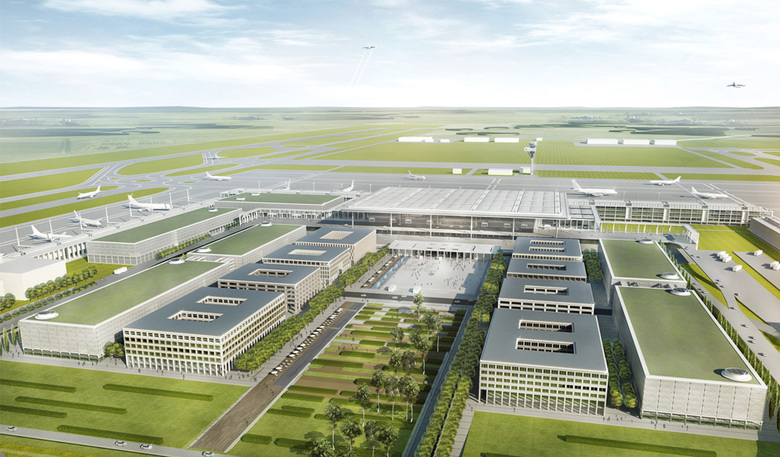 Das städtebauliche Konzept sieht eine axiale Anordnung vor, in der das Terminal das zentrale Gebäude ist und den Kopf der Gesamtanlage des Flughafens darstellt.