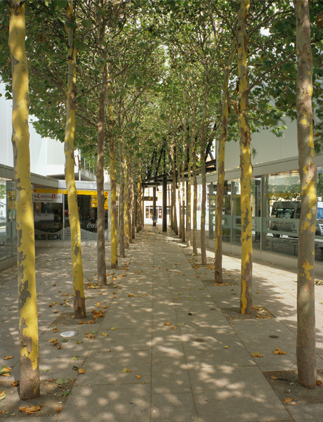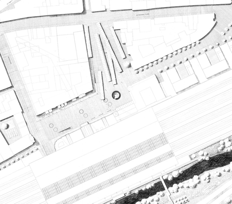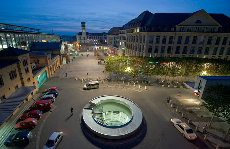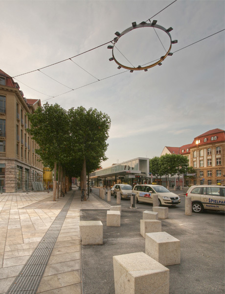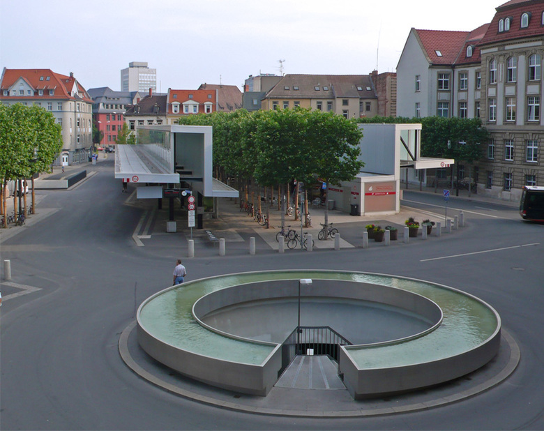Über die Wasserbecken-Rotunde, die zugleich den Fußgängereingang zur Tiefgarage darstellt, wird der Platz mit dem ebenfalls neu gestalteten Busbahnhof verbunden. Und auch dieser wird in die räumlich-ästhetische Qualität des Willy-Brandt-Platzes eingebunden: Ein schwebendes „Mikado“ aus geschnittenen Platanen und gläsernen Riegeln definiert Raumkanten sowie Übergänge und dient als Filter. Die Platzfläche darunter bleibt offen, großzügig und überschaubar.