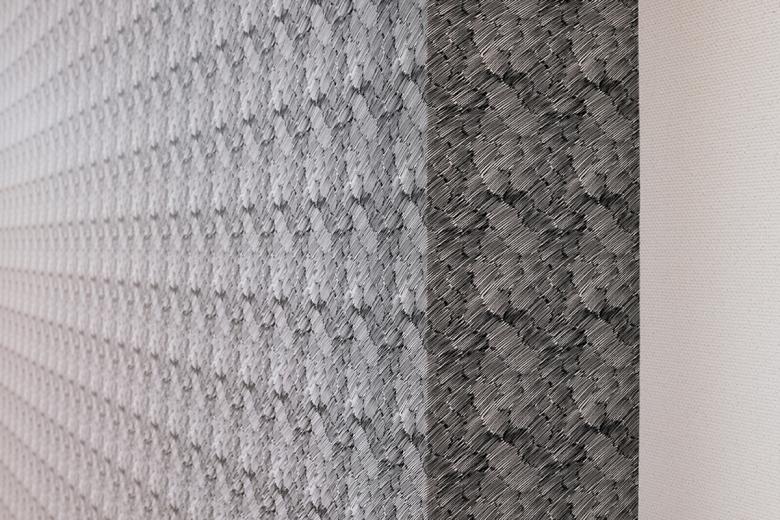 アーティスト 松延総司のデザイン。「黒色/影を身体的な描線で捉え直した、図案としてのコンセプチュアルアート。近づけば手書きの線、離れればモアレのような複雑な模様、行為としては「塗りつぶし」や「取り消し=無」を表す。