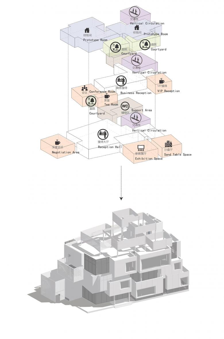 We re-analyzed the programs and circulations of Vanke's sales center and categorized them differently. We merged the core and communal space and defined it as a big "noisy" space that flows through three floors. And the audio-visual hall, sandbox area, office, model room, tearoom, coffee, meeting, negotiation, signing, VIP reception, indoor garden and other rooms are independent as "quiet" small boxed-shape plug-ins attached to the big space according to the flow line in turn. You can recognize these stacked boxes on the façade and see part of the flowing "noise" in the gaps of the boxes.