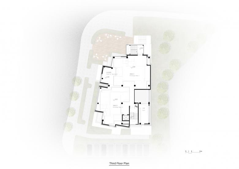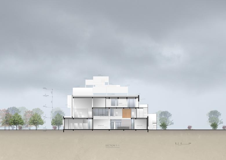 Although the site is a prototype city, the actual buildable land restrictions are very high. After meeting various planning and fire-proof conditions, the narrow trapezoidal building site within the building setback line is about 500 square meters, and the height limit of the structure cannot exceed three floors. The total construction area of the prototype, including two sets of sample houses, is only more than 1000 square meters. This small demonstration area center actually has no extra floor space as a stage for people to perform.