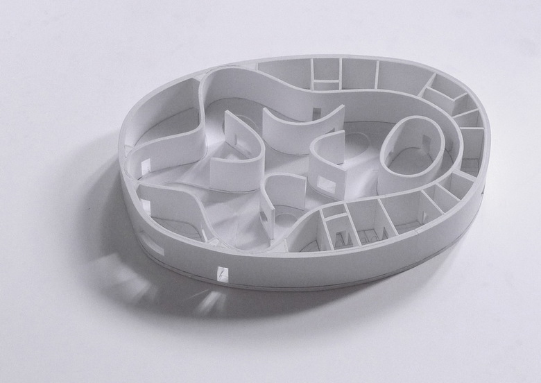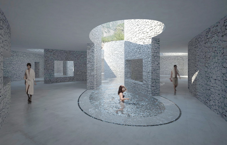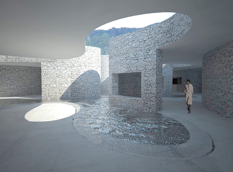 The experience of this spa is about protection, fluidness, and the presence of nature. The spa is surrounded by a double skin of large stone walls which acts to both house the functional program of the building and also to create a form of protective layering between the inner area of the pools and the outside world. Within this interior world of the pools movement is guided by a transitional space operating akin to an engawa; an external covered path that links all programs within the spa. This movement path traces its course around the water at the heart of the spa, with the pools enclosed by a layered series of walls, yet open to the sky of the experience of nature.