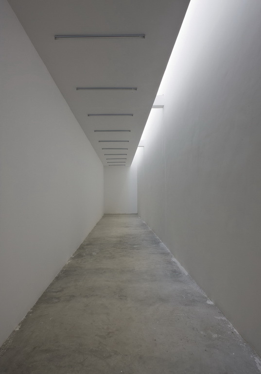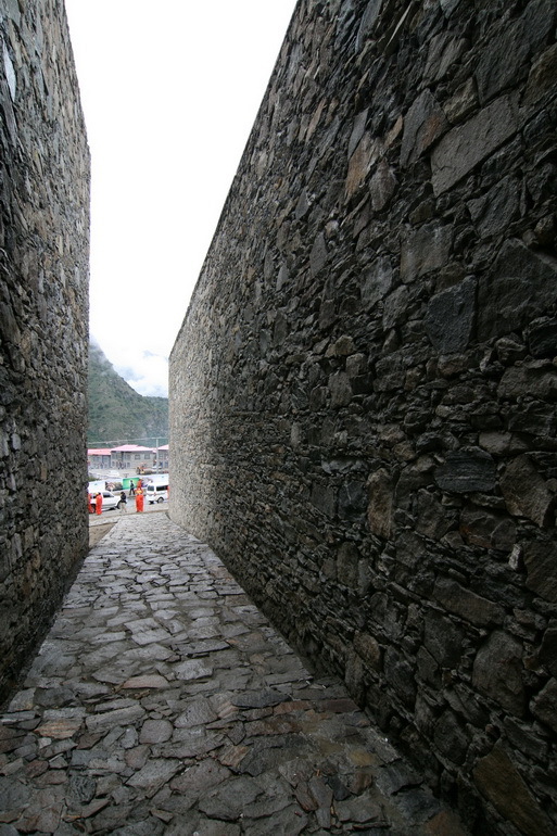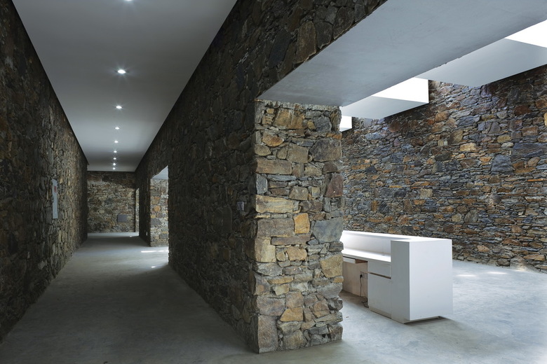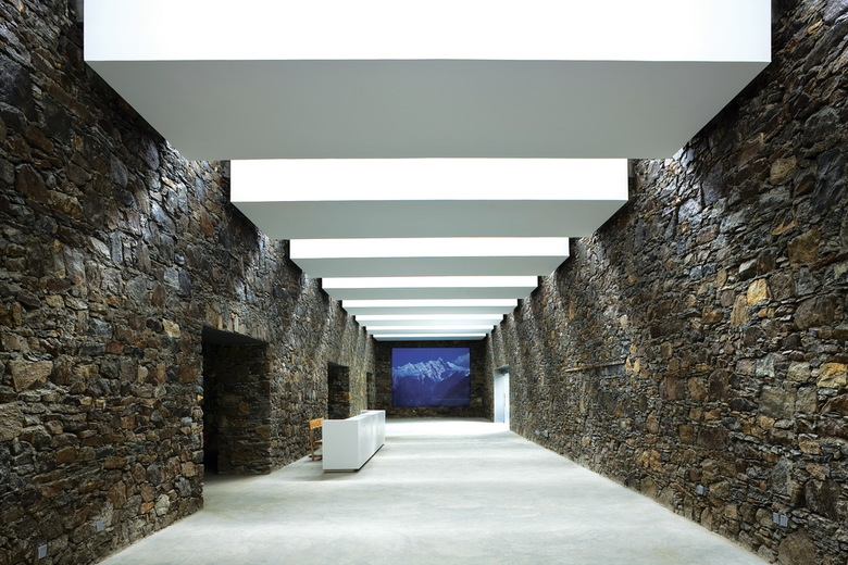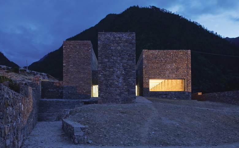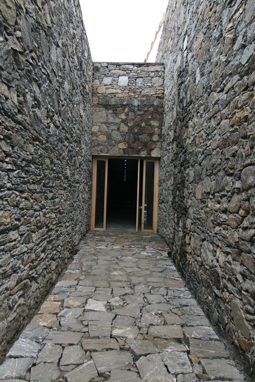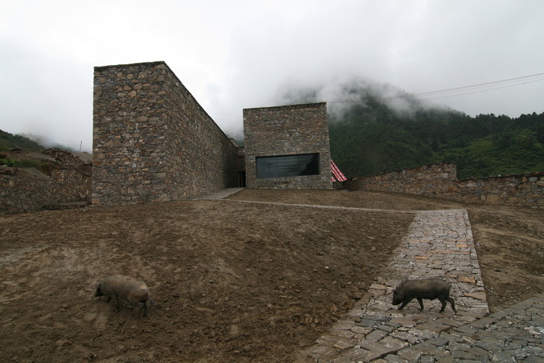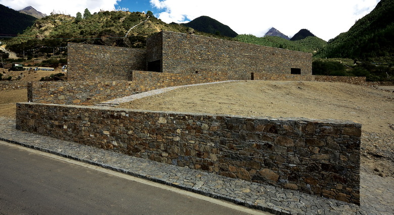 Like a few slices of rock extending out of the mountain, the building is conceived as a series of stone walls set into the slope, with no windows facing the incoming road in the west, almost scale-less, an abstract landscape in the natural landscape. Looking from afar it neither hides itself, nor stands out from its background as a piece of “Tibetan” architecture.