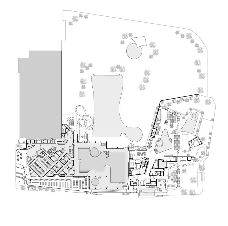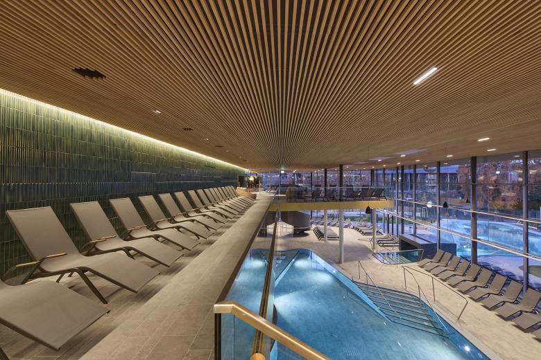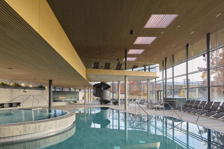 Der Thermenbereich ist von geschwungenen Formen geprägt, die fließende Raumfolgen erzeugen und eine intuitive Orientierung ermöglichen. Der Neubau erstreckt sich über drei Ebenen: Während sich das Badeangebot im Erdgeschoss nach innen und außen öffnet, entfaltet sich die Saunalandschaft als vertikale Raumsequenz über alle Geschosse hinweg. Ergänzt wird das Raumprogramm durch gastronomische Angebote mit unterschiedlichen Aufenthaltsqualitäten – ein Restaurant im Erdgeschoss, eine Kaminlounge im ersten Obergeschoss sowie großzügige Liegebereiche im zweiten Obergeschoss mit Blick auf Park und Stadt. Alle Ebenen verfügen über direkte Außenbezüge, darunter ein Saunagarten, ein an die Thermalhalle angeschlossener Freibereich und eine Dachterrasse.