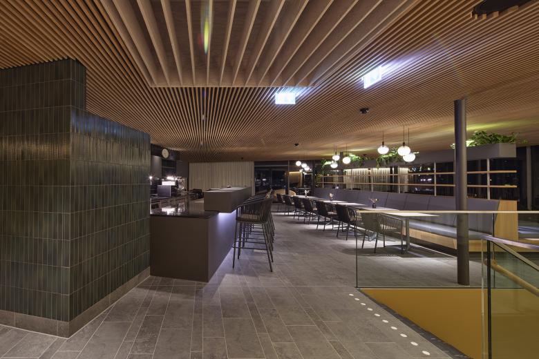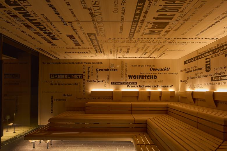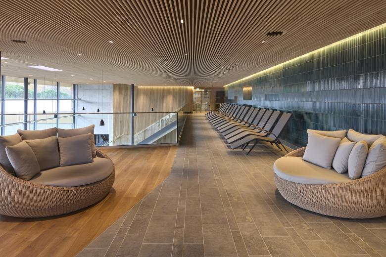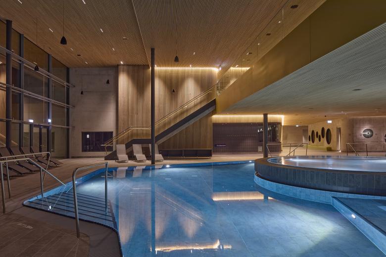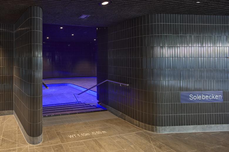 Gestalterisch zeigt sich die Therme bewusst ruhiger und klassischer als das bestehende Freizeitbad. Ziel war es, eine zeitlose Atmosphäre mit hoher Dauerhaftigkeit zu schaffen. Warme Materialien wie Holzlamellen, Feinsteinzeug und keramische Beläge in gedeckten Farbtönen prägen die Innenräume. Auch die Becken sind grau gefliest und unterstreichen den ruhigen, zurückhaltenden Charakter der Anlage. Die Lichtgestaltung ist integraler Bestandteil des architektonischen Konzepts: Eine zurückhaltende Grundbeleuchtung wird durch präzise gesetzte Lichtlinien ergänzt, die architektonische Elemente akzentuieren und die Orientierung unterstützen.