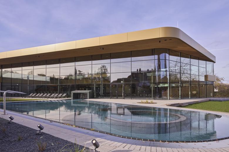 Die neue Außenverkleidung greift mit ihrer Farbgebung ein regionales Motiv auf. Ihre goldene Tönung orientiert sich an gereiftem Riesling und übersetzt die lokale Weintradition in eine zeitgemäße architektonische Sprache. Umlaufende Fassadenbänder fassen den Thermenbereich zusammen und machen zugleich das Zusammenspiel von Bestand und Neubau ablesbar.