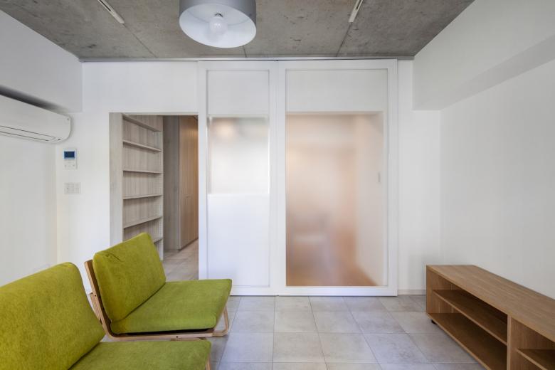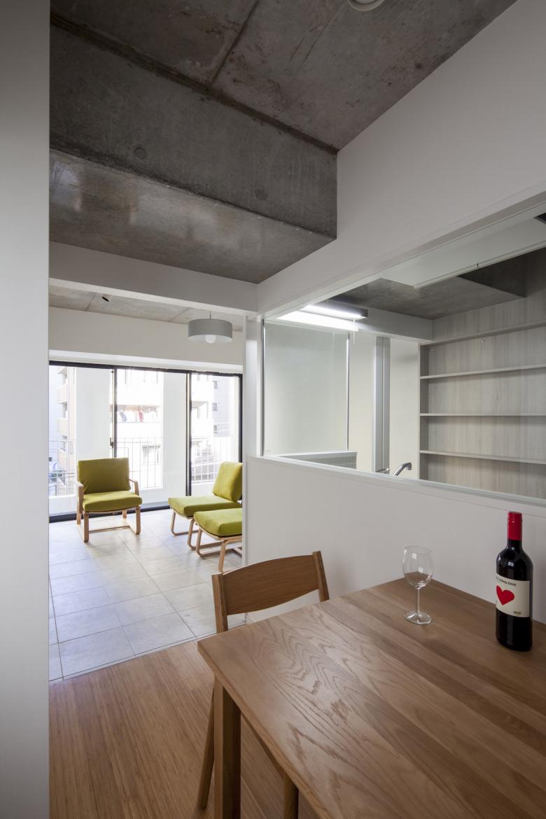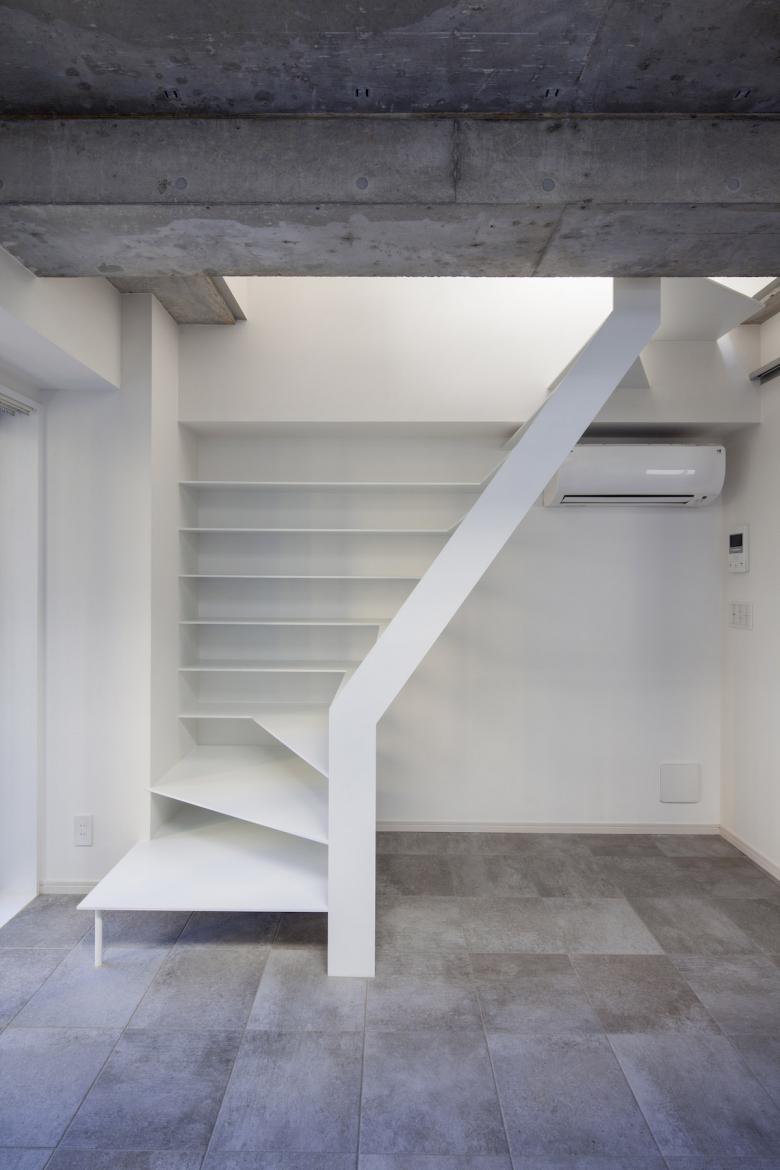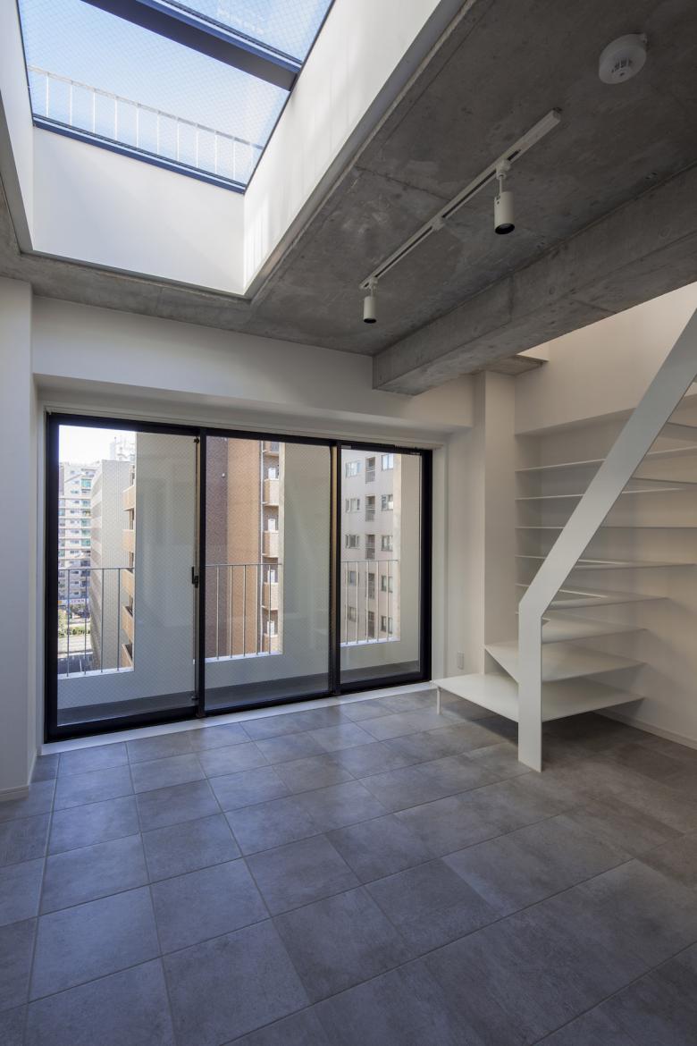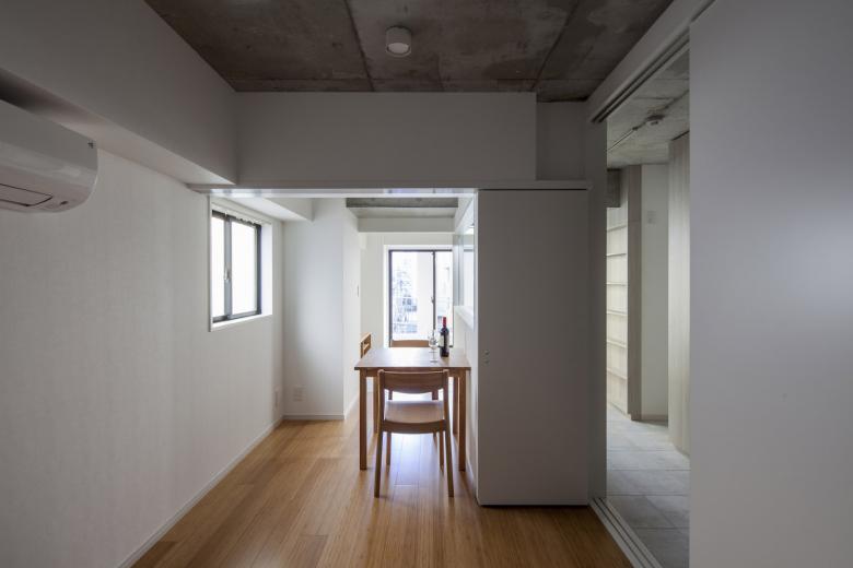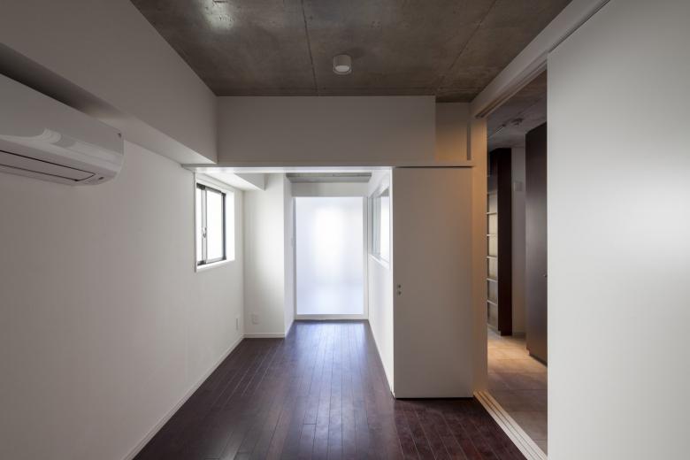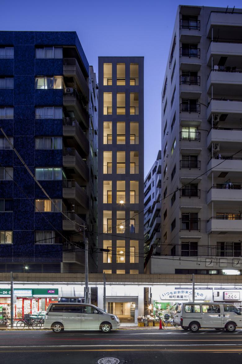 3階から9階は各階1住戸の集合住宅としている。約13mの住戸内の奥行きを活かすために敷地奥側に設けられた玄関から、道路側のテラスまでが見通せる廊下状のスペースを設けている。収納やキッチンは部屋内に設けず、この廊下に面して設けることで、各部屋の機能が入居者によって自由に設定でき、またキッチンを中心に各部屋をつなぐ回遊性の高い動線計画とすることで、多様な使い方ができるようにしている。