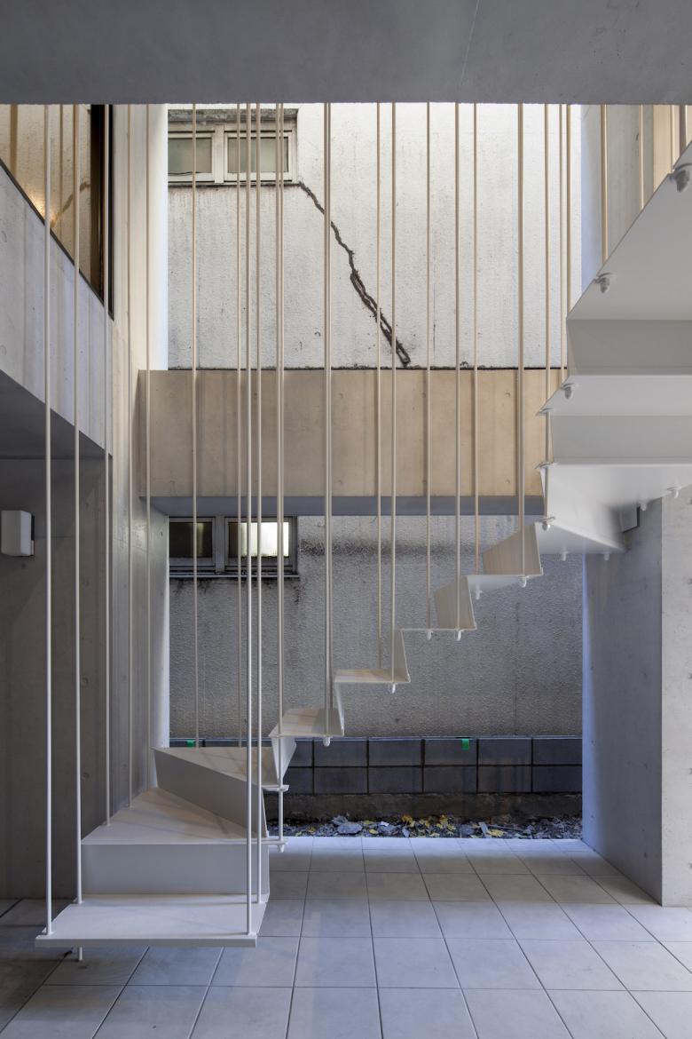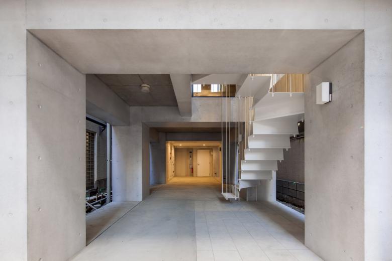 1階は集合住宅のエントランスホールを敷地の一番奥に配置し、道路側には吊構造の階段を2階の店舗への専用階段として設けている。この階段と吹き抜けが、日中アーケードによって暗くなってしまいがちなエントランスに光を導くようにしている。