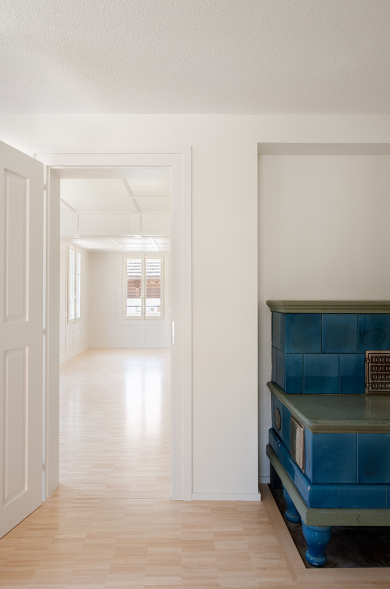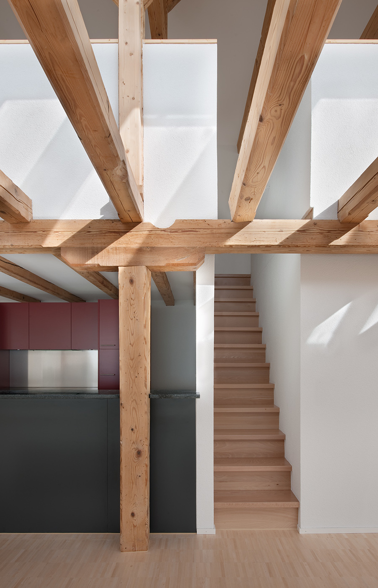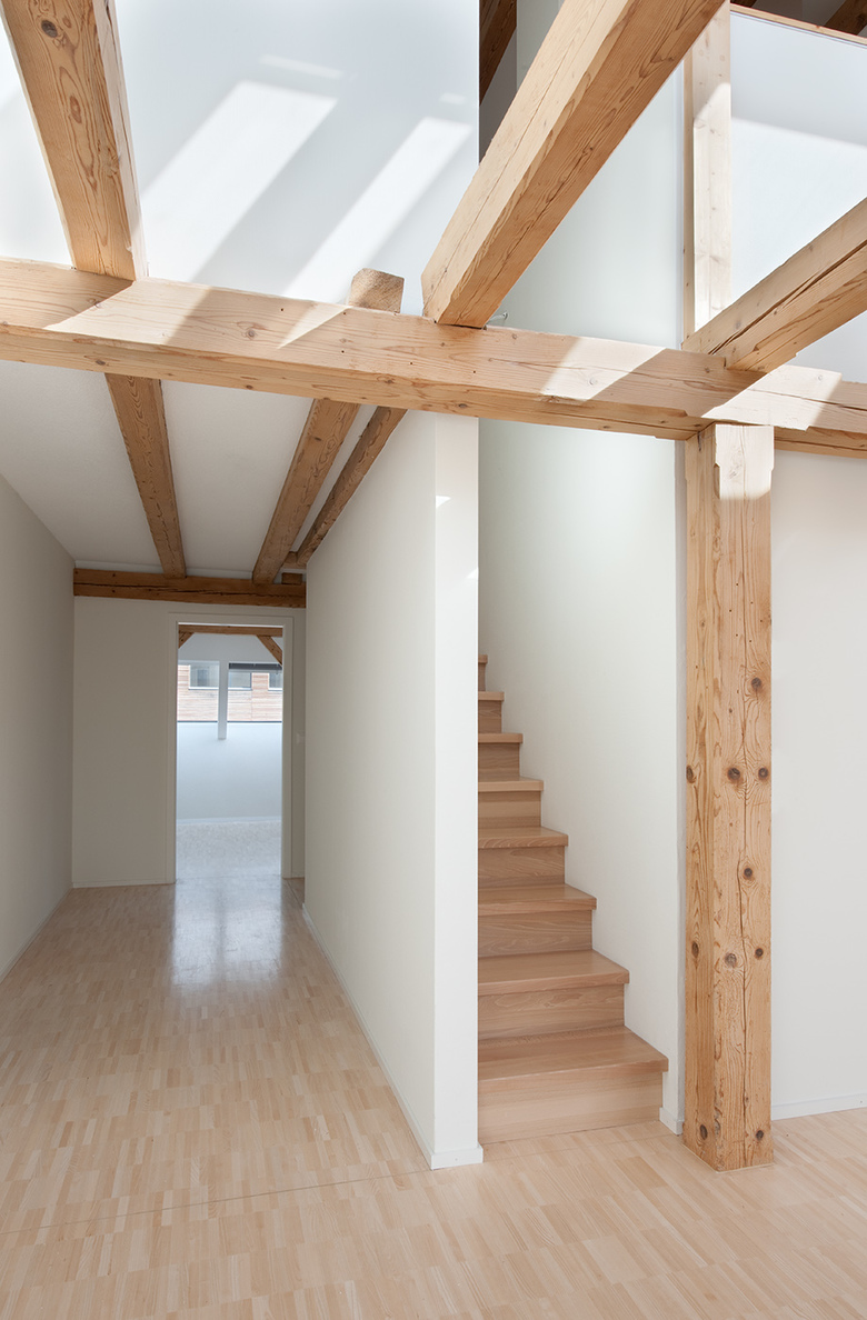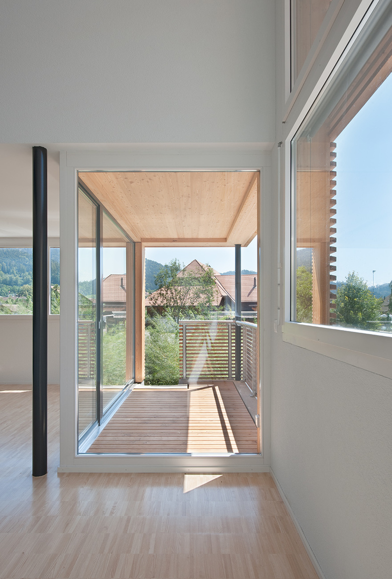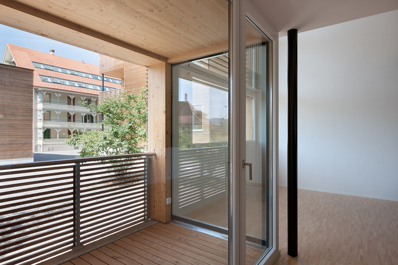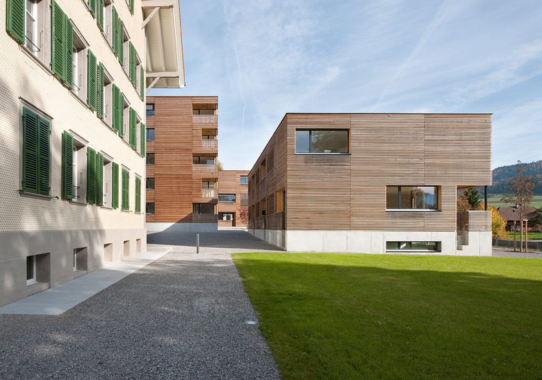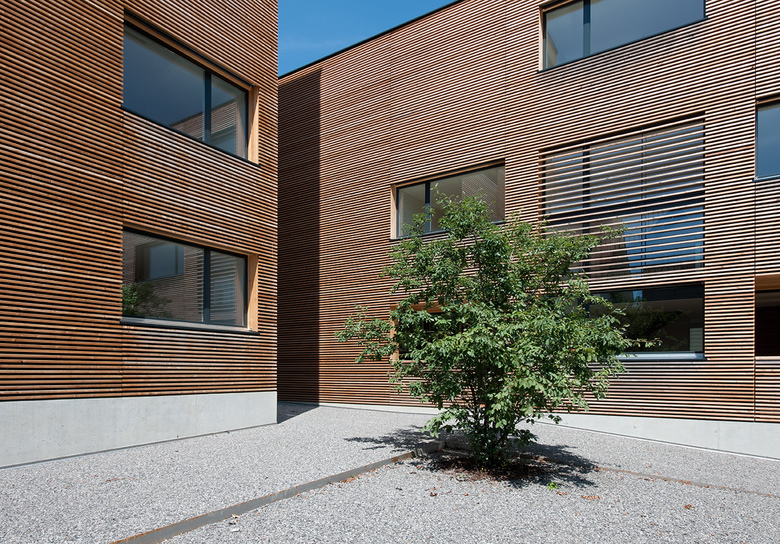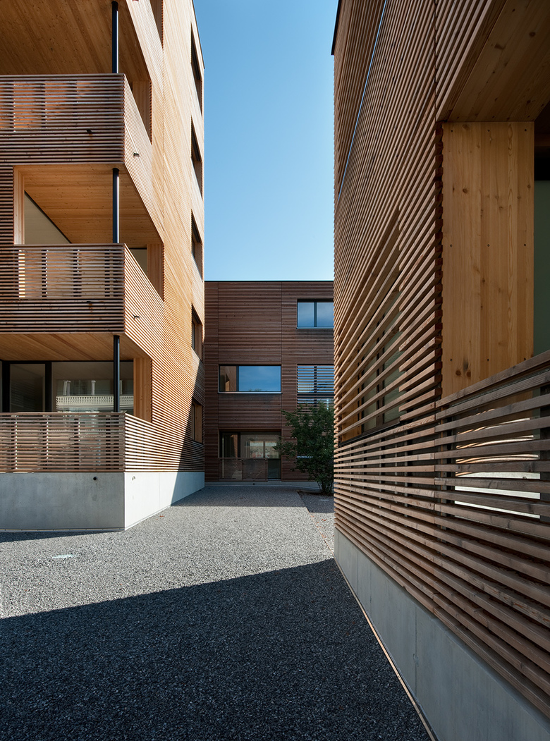 Die Volumen von unterschiedlicher Höhe und Länge definieren drei Höfe mit differenzierten Charakteren und unterschiedlicher Gestalt. Durch den einheitlichen Kiesbelag ist das Mühleareal zu einem öffentlichen und fussgängerfreundlichen Quartier geworden. Die neuen Wohnungen profitieren durch ihre Ausrichtung von diesen Aussenräumen. Terrassen und Eingänge sind in die Volumen eingeschnitten, was den Gebäuden monolithischen Charakter verleiht. Die drei Neubauten sind in Holzkonstruktion ausgeführt. Die Aussenhaut besteht aus horizontalen Holzlamellen. Diese horizontale Struktur ist als Hommage an das alte Getreidesilo zu verstehen, welches diesen Ort geprägt hat. Um die Privatsphäre der Bewohner zu gewährleisten ist das Erdgeschoss leicht vom Terrain abgehoben. Ein Betonsockel gleicht die Niveaudifferenz aus.