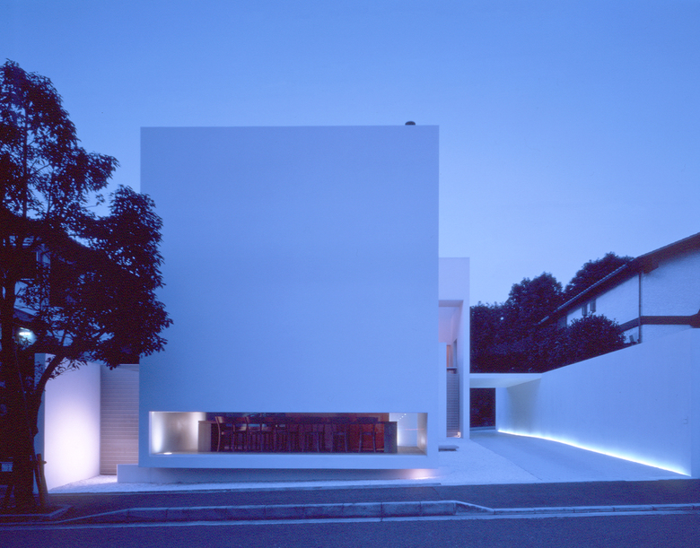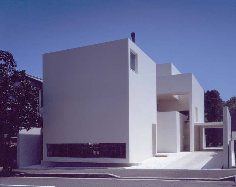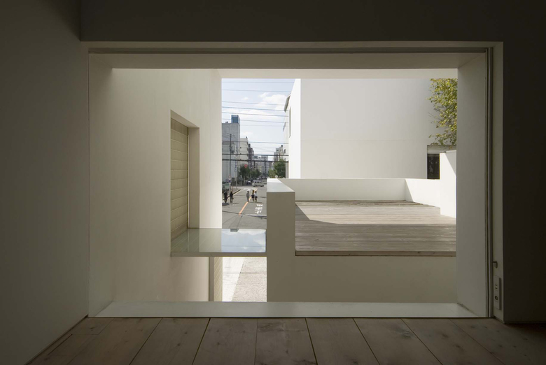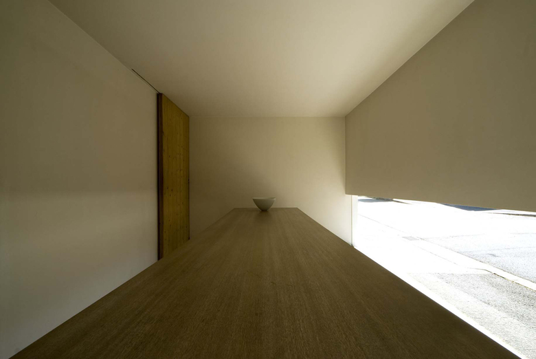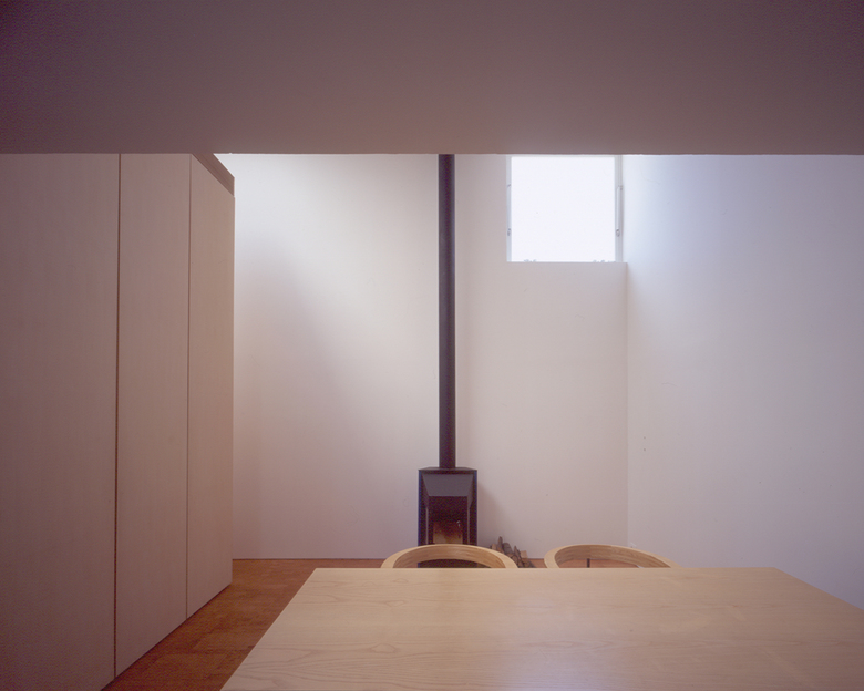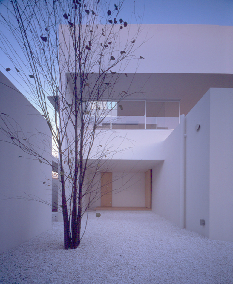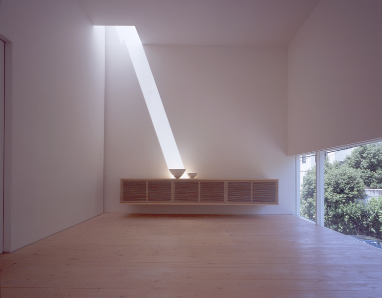 空間を切り取る全ての壁は、白い面で構成される。白い壁に映る光、翳、様々な表情が空間に場をつくる。