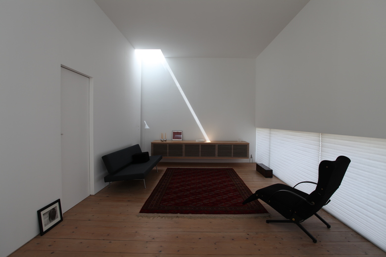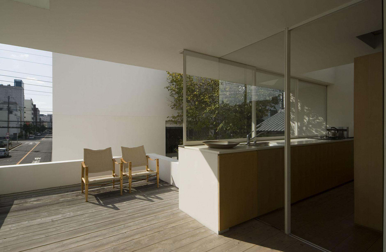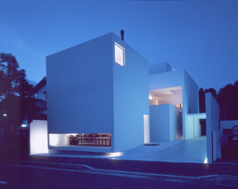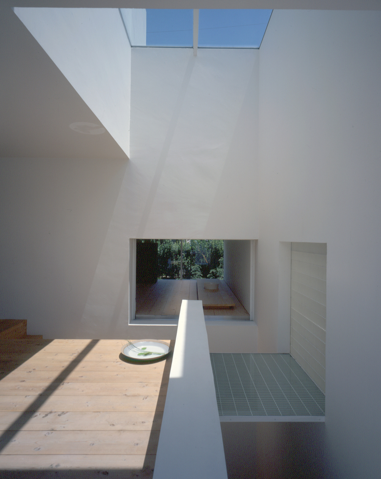 直方体のつくる空間は、壁によって単純に分割される。これらの壁は開口部を持つことで互いの空間を関係づける。アトリエの地窓、中庭、洗面室を抜け浴室の坪庭を通る外からの流れ。中庭、デッキを中心にかわされる視線や会話。様々な気配が、壁を通してつながりあう。