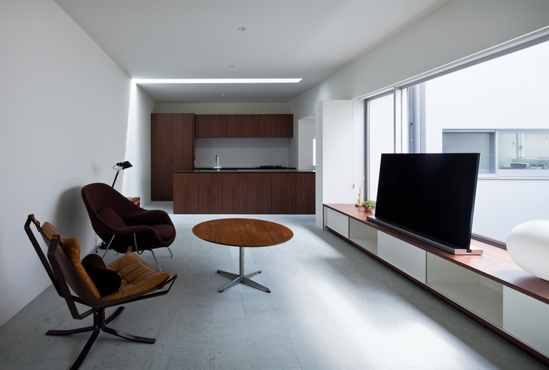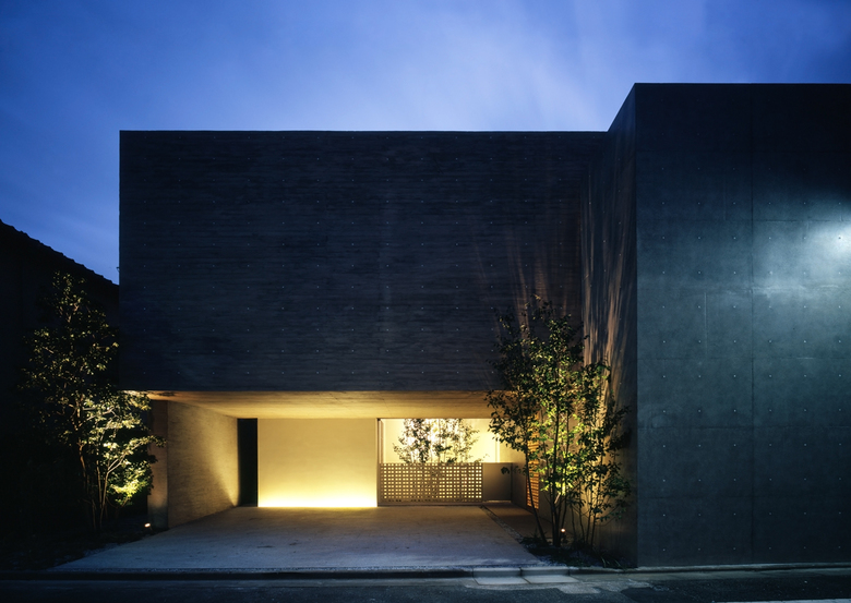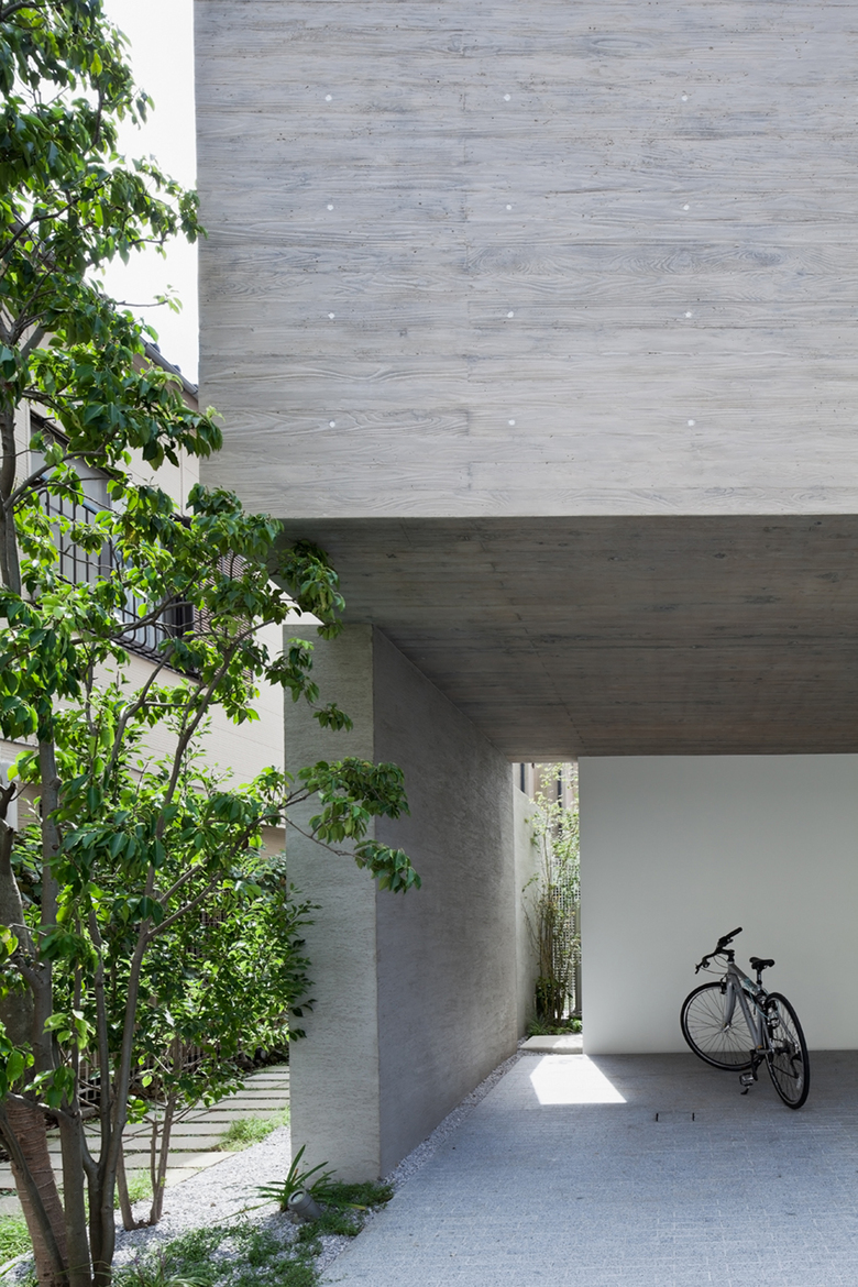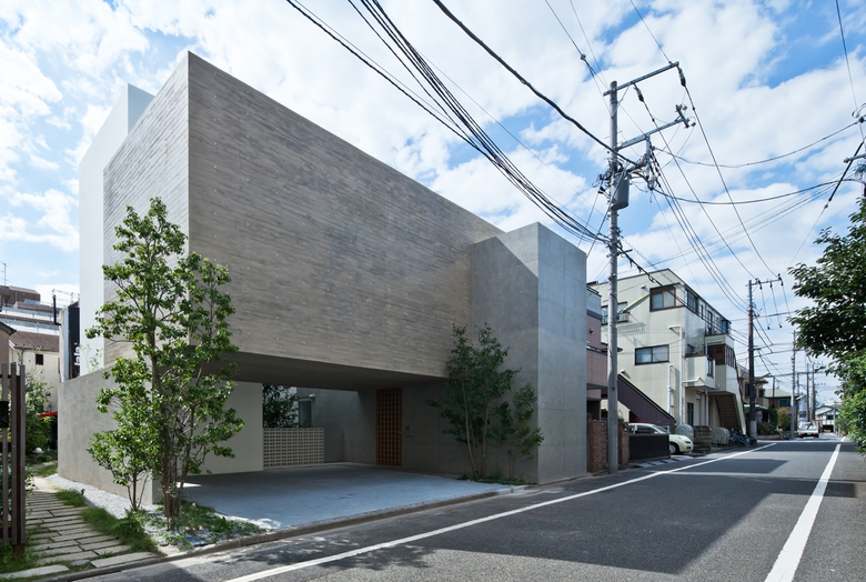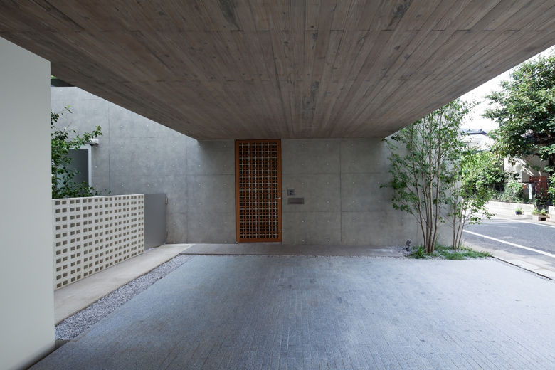 敷地は都心に近い閑静な住宅街にある。深沢の家は、前面道路に対し、アプローチ・駐車スペースでもある浮かんだコンクリートボリュームによるピロティ空間を設けており、さらに奥に中庭をつくることでプライバシーを確保した半コートハウス住宅ともいうべき佇まいである。
