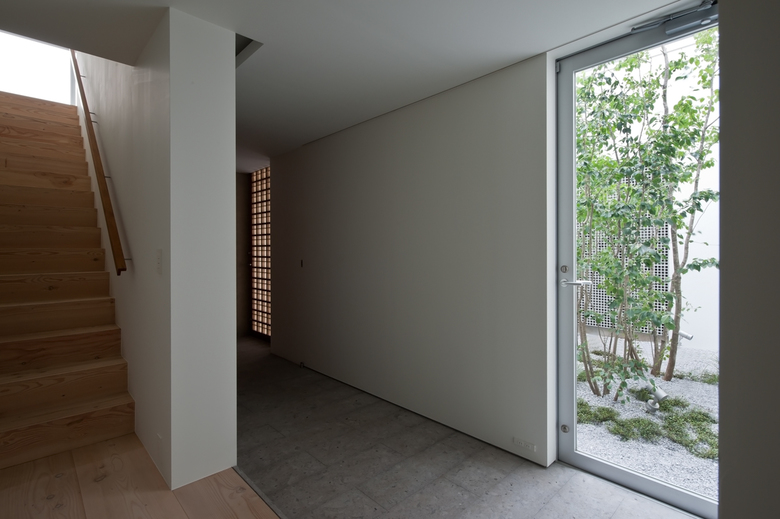 ピロティからその先に見える緑に誘われて玄関へと入ると、中庭を中心に螺旋状の動線を描いて、ピロティ・玄関・階段・2階リビング・・・と奥へ奥へ空間が連続し、展開していく。中庭を中心に回遊する平面形は、住宅内に自然の気配をもたらすと同時に、シームレスに連続する空間をつくり出している。