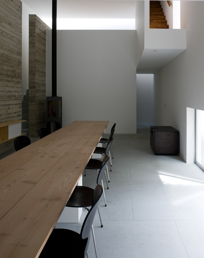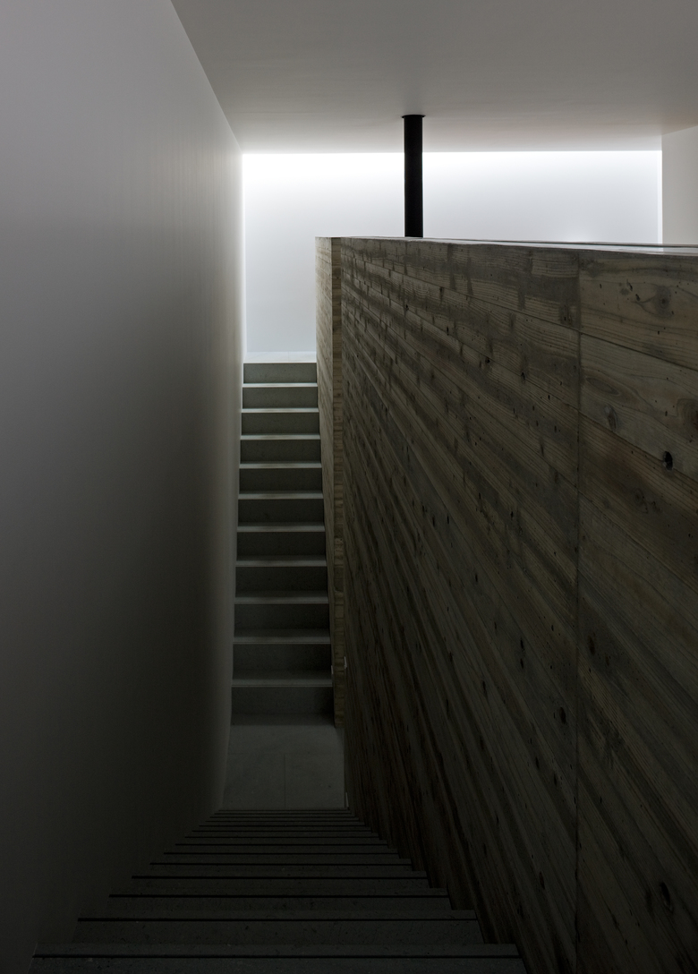 杉板のテクスチャの残るコンクリート壁は空間を引き締め、ペントハウスへと続く階段が、吹抜けの中に浮かんでいるように見えることで、空間に豊かな表情とシーンを与える。