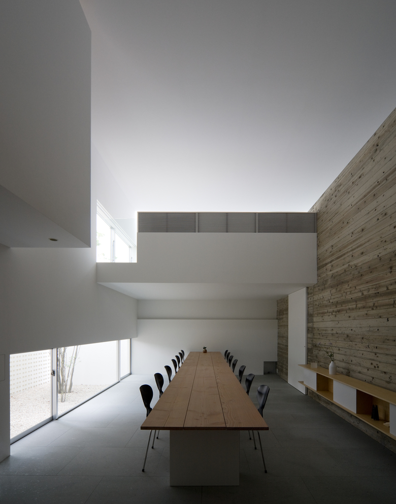 執務スペースへと続く2本の階段では、ついたての様に曖昧に仕切る壁による空間のつながりとトップライトから落ちる光により、上方へ導かれるように上へと進む。執務スペースは吹抜けを介しもう一方のスペースまで見通せる、水平に広がる空間となっている。