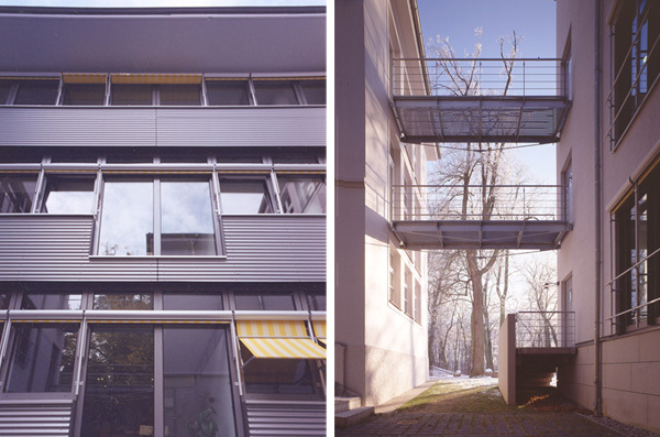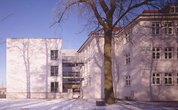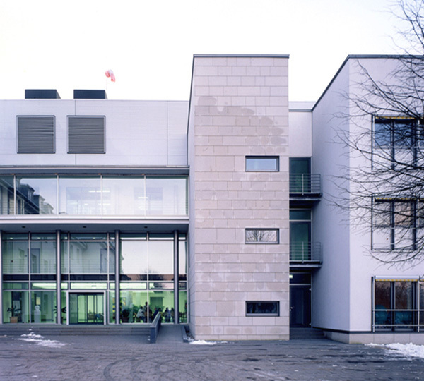 Die Anschlüsse zum Altbau werden durch Glasfassaden hergestellt. Das Technikgeschoss ist mit Aluminiumwellblech verkleidet. Der Haupteingang ist durch ein natursteinverkleidetes Treppenhaus in Achse der Allee markiert.