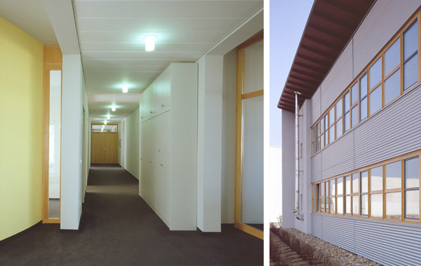 Das zweigeschossige Gebäude berücksichtigt in Statik und konstruktiven Details sowie baurechtlichen Belangen, eine mögliche Erweiterbarkeit auf drei Geschosse. Das Erdgeschoss wird über eine Freitreppe erschlossen. Das Obergeschoss kann durch das direkt daneben befindliche Treppenhaus auch separat erschlossen werden. Die Längsseiten des Gebäudes sind betont horizontal entwickelt. Unterstützt wird die Gestaltungsabsicht durch die Aluminiumwellblechverkleidung der Brüstungsbänder im Wechsel mit den in Oregon-Pine naturfarbenen horizontalbetonten Fensterbändern. Die auskragende ochsenblut-rot gestrichene Dachkonstruktion mit sichtbaren Sparrenköpfen, gibt dem Gebäude einen markanten Abschluss.