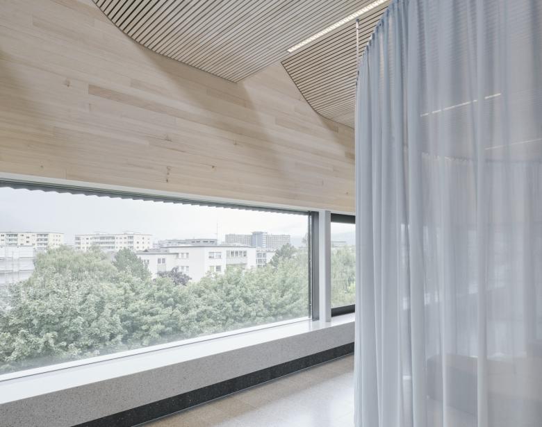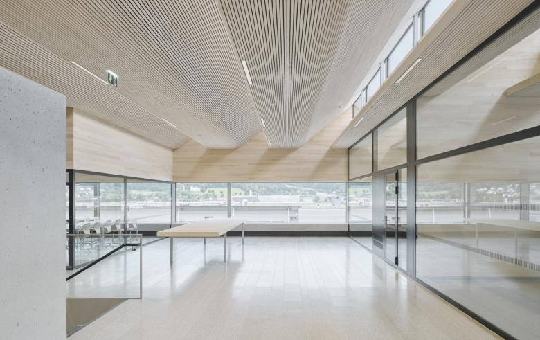 Im Inneren zeichnet sich die Aufstockungsebene durch eine offene und transparente Raumsituation aus. Umlaufende Fensterbänder erlauben einen „Rundumblick“ über Innsbruck. Die Überspannung mit einem weitgehend stützenfreien Lamellendach impliziert mit der ausgewogenen und schattenfreien Belichtung ein atelierartiges Ambiente. Die weitergeführten Stiegenaufgänge, die Transformierung eines bestehenden Luftraumes zu einem verglasten Bodenausschnitt mit umlaufender Sitzgelegenheit und die in massiven Sichtbeton ausgeführten Sanitärkerne verweben den Bestand mit der neuen Aufstockung.