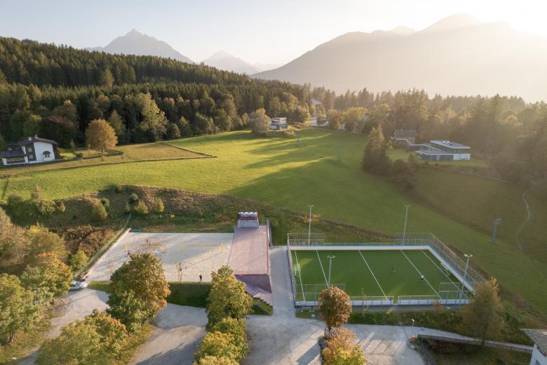 Die Sportflächen wurden sowohl in Hinblick auf die Höhenlage, als auch auf die Ausrichtung so in den Hang gesetzt, dass die Eingriffe in das Gelände minimiert werden konnten und für alle Bereiche ein barrierefreier Zugang vom bestehenden terrassierten Parkplatz der alten Patscherkofelbahn gegeben ist. Die südlich benachbarte Feuchtwiese wird in durch die gewählte Bepflanzung der Böschungen thematisch weitergeführt, was den landschaftsplanerischen Ansatz des Gesamtentwurfes noch verstärkt.