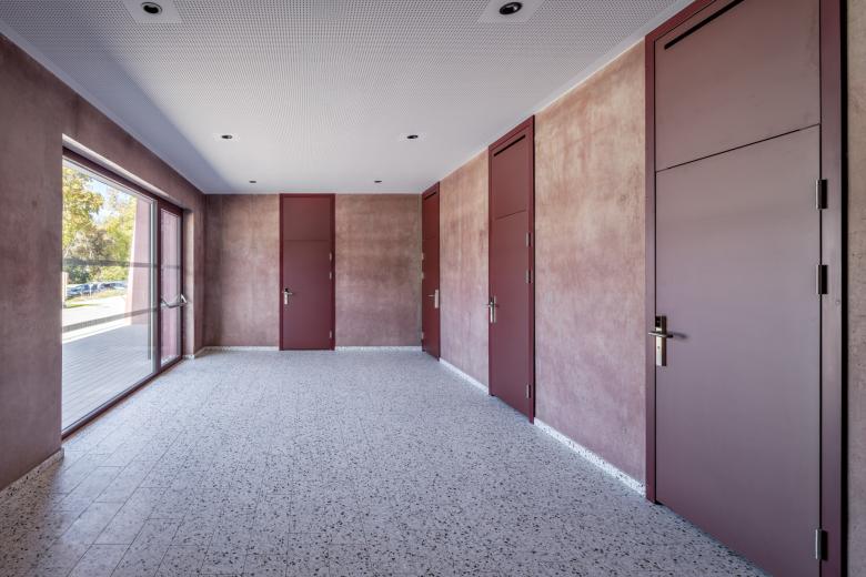 Die Bauteile des Infrastrukturgebäudes strahlen in Materialität und Ausformung in Entsprechung zur Bauaufgabe eine gewollte Robustheit und Massivität aus. Der rot eingefärbte Beton der sichtbaren Wand- und Deckenbauteile sowie der Stiege wird ergänzt durch eine Fassadenausführung, die mit den, mit schwarzen Holzlatten beplankten, Schiebelementen eine abwechslungsreiche Lebendigkeit erfährt. Die Stahlgeländer der oberen Ebene weisen eine reduzierte Anmutung auf und schließen somit thematisch an die Sichtbetonkonstruktion an. Die gewählte Farbgebung und Materialisierung wird auch im Gebäudeinneren fortgeführt wodurch eine gesamtheitliche atmosphärische Wirkung gegeben ist.