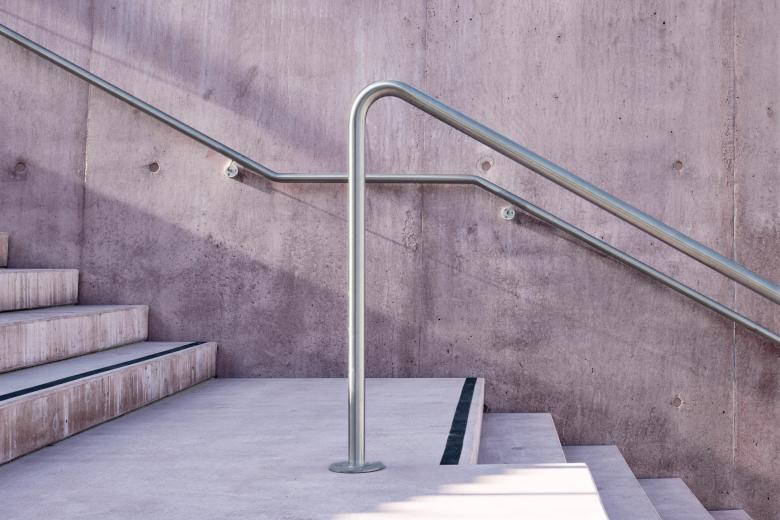 Die außenliegende Treppe verbindet die beiden Ebenen an zentraler Stelle derart, dass sie in selbstverständlicher Art den Übergang vom Gelände entlang des Parkplatzes zum Gebäude akzentuiert. So verschwimmt das Gelände nicht nur in Nord-Süd-Richtung sondern auch in Ost-West-Richtung mit der Umgebung.