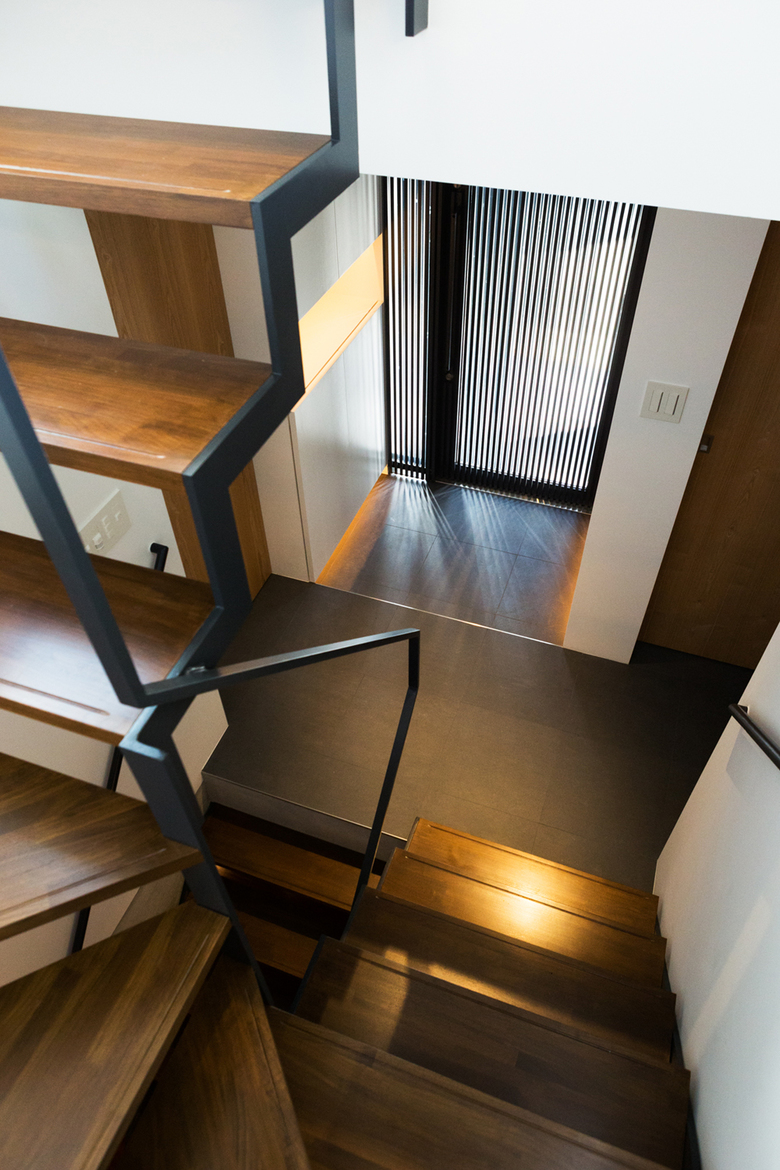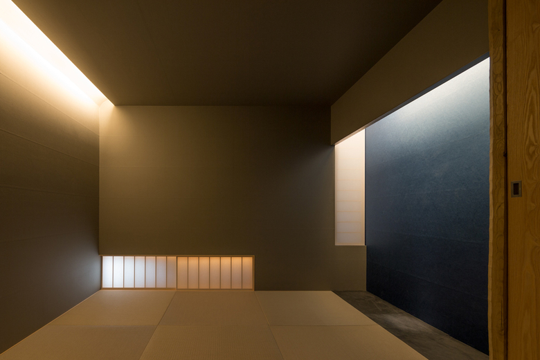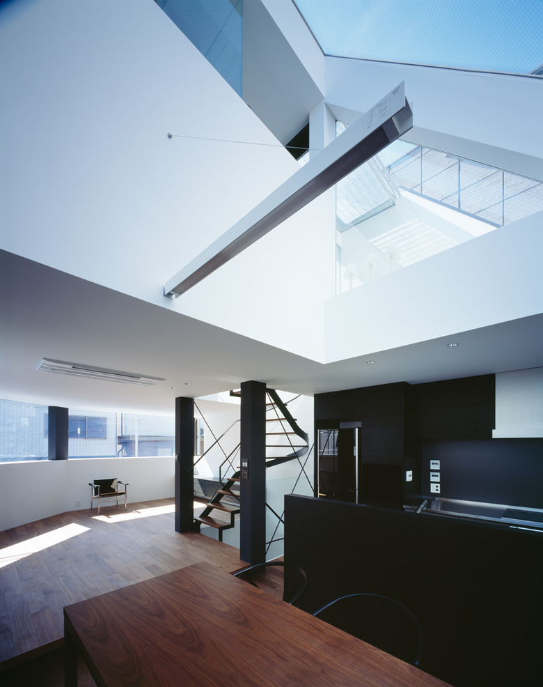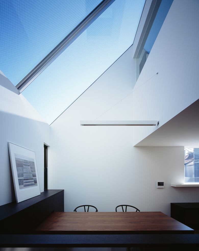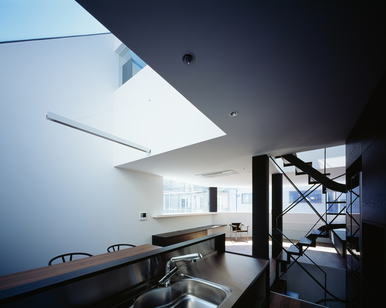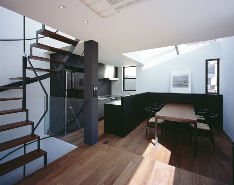 ワインの貯蔵庫としての地下室には特注のラックやソファ、書斎や本棚なども設え、電子ドラムの演奏も楽しめる。1階には広めの納戸。そして客間としての和 室は自然光を極力抑え、灰色や藍色の和紙、灰桜色の畳などが建築化照明と一体化し、小宇宙をつくり上げている。2階には料理好きの建主の為にゆとりある オープンキッチンに加え、大勢のゲストが集えるウォルナットのダイニングテーブルを造作。大きな天窓からは、吹き抜けを介して柔らかい拡散光が降り注ぎ、 椅子座のダイニングと床座のリビングが段差により緩やかに連続し一体感を生み出している。3階にはバス・トイレ等の水廻りや主寝室などのプライベート空間 と小さな坪庭も併設。中央のストリップ階段を介し、4層を上下に移動しながら楽しめる本住宅は、天窓や高窓、コーナー窓などから自然光が注ぎ込み、多様な開口部で切り取られた街並みや空のシーンが室内のアクセントとなり、都市住宅とは思えない広がりや奥行きが生まれている。