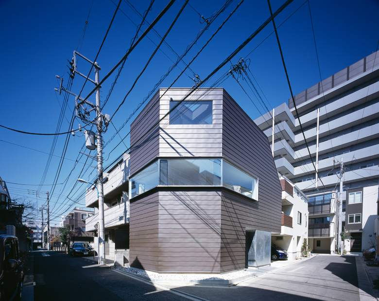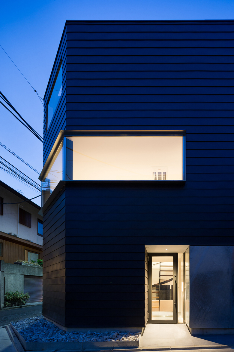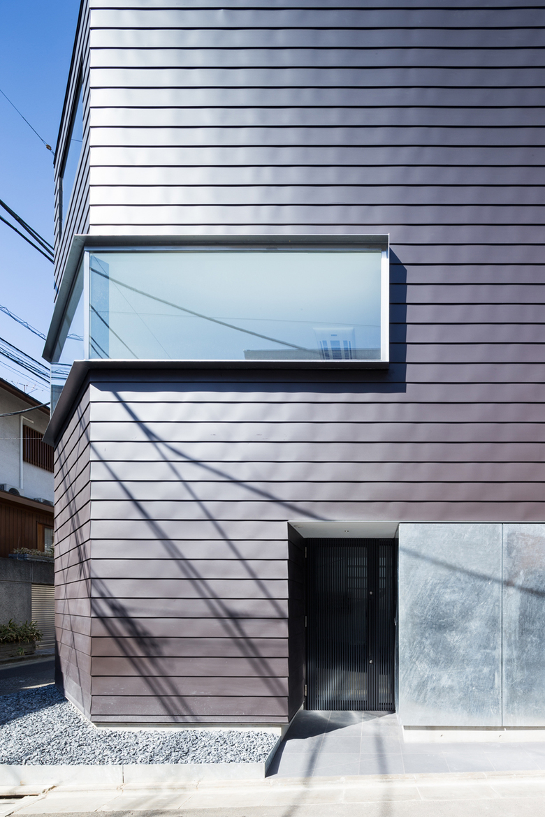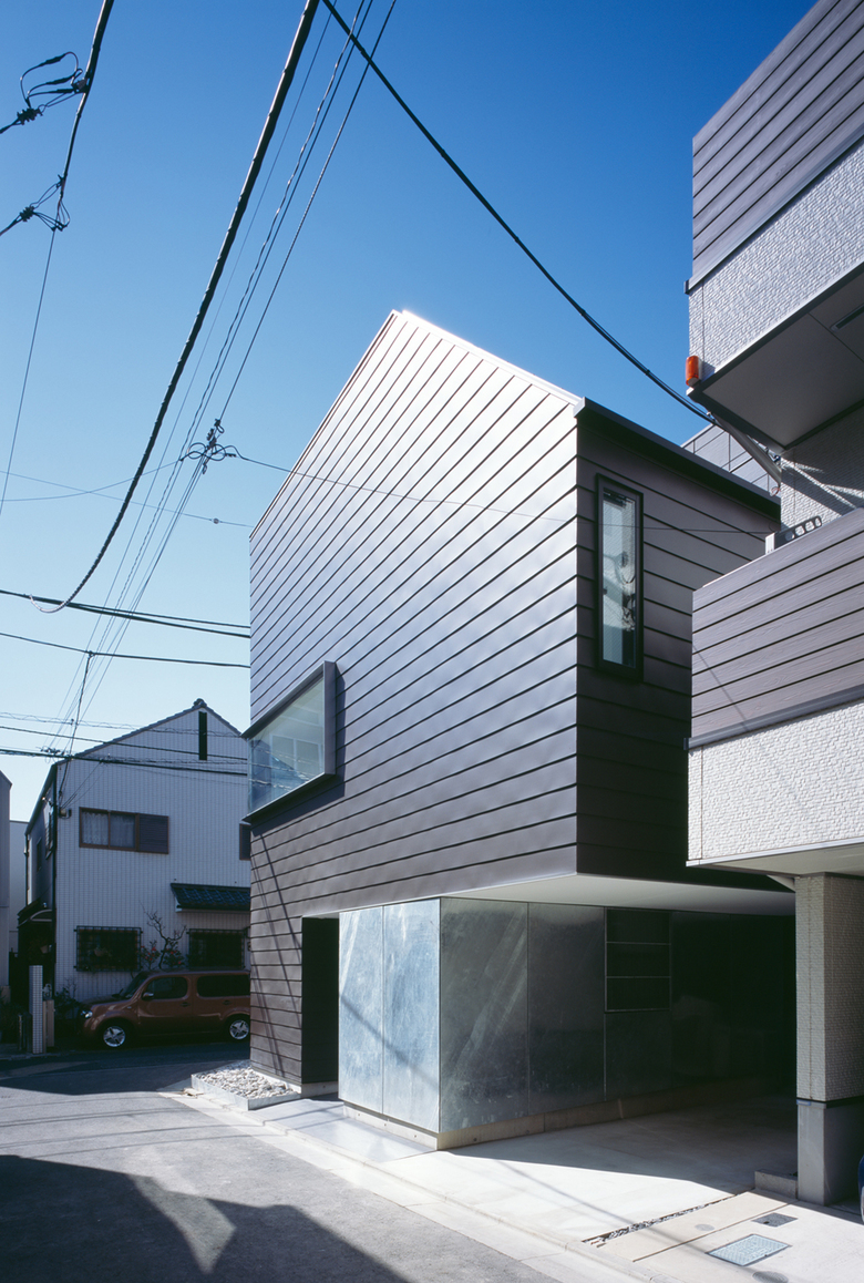 東京神楽坂の閑静な住宅街に建つ単身者のための住宅。外壁は濃茶色のガルバリウム鋼板を長尺横葺きで使用し、黒板塀で囲われた花街の雰囲気と調和を図った。玄関横やガレージ周りの外壁には溶融亜鉛メッキ鋼板を使用し、異なる鋼板の組み合わせで遊び心のあるコントラストが生まれた。外観は角地の特性を生かしたパノラマコーナーウィンドウが象徴的で、道路側の景色が水平に切り取られ、コンパクトな室内に奥行きと広がりを与えている。
