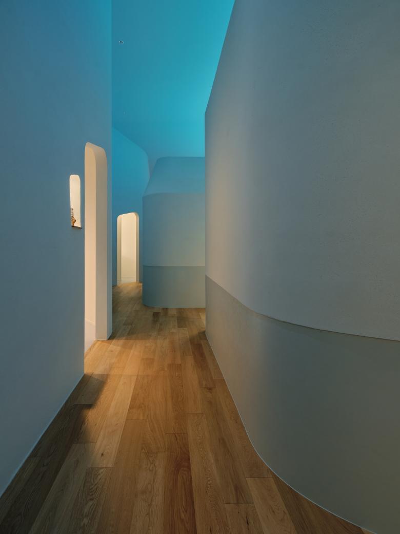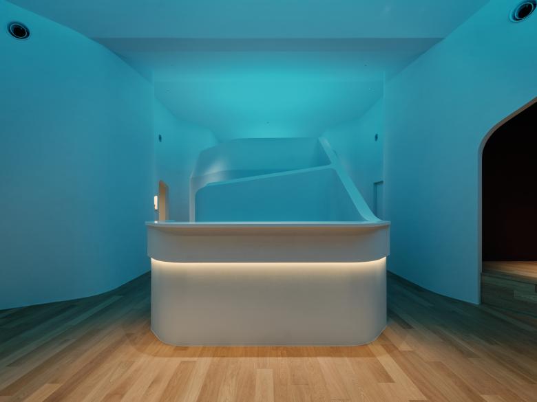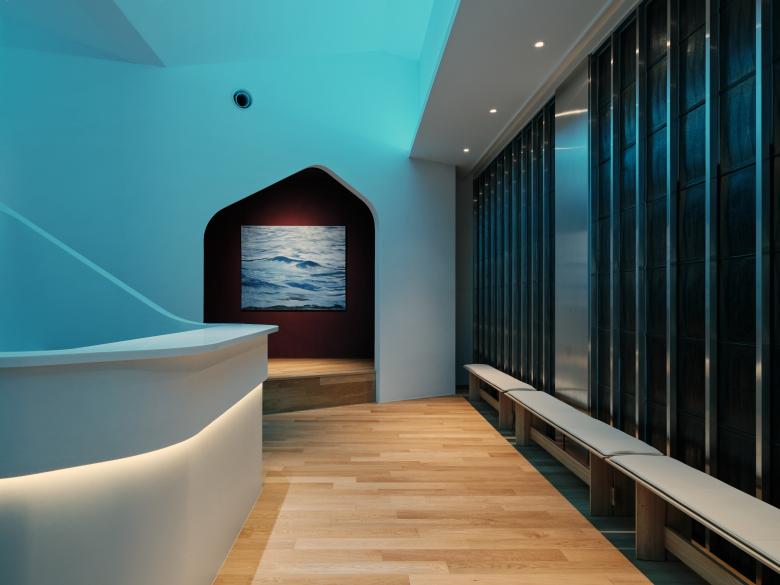 開口部の上部や空間の中央にある技工室上に設置したアッパーライトには、空色のアズール光を採用したサーカディアン照明を使用。光の反射が通路に奥行きを与え、青の洞窟のような没入感を生み出しています。