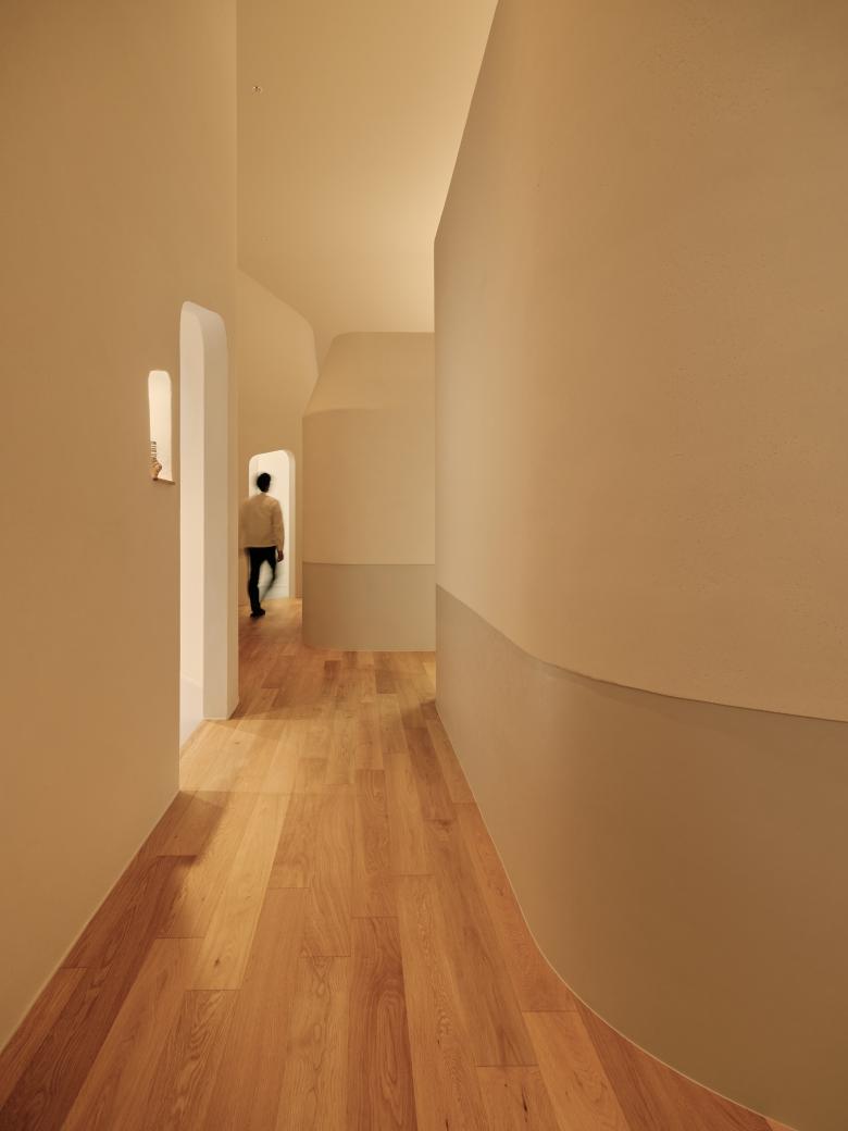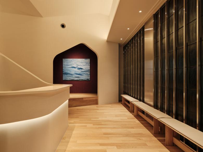 漆喰壁の滑らかな質感は、北面ガラスファサードからの自然光や間接光をやわらかく拡散し、待合室を明るく落ち着いた空間にしています。