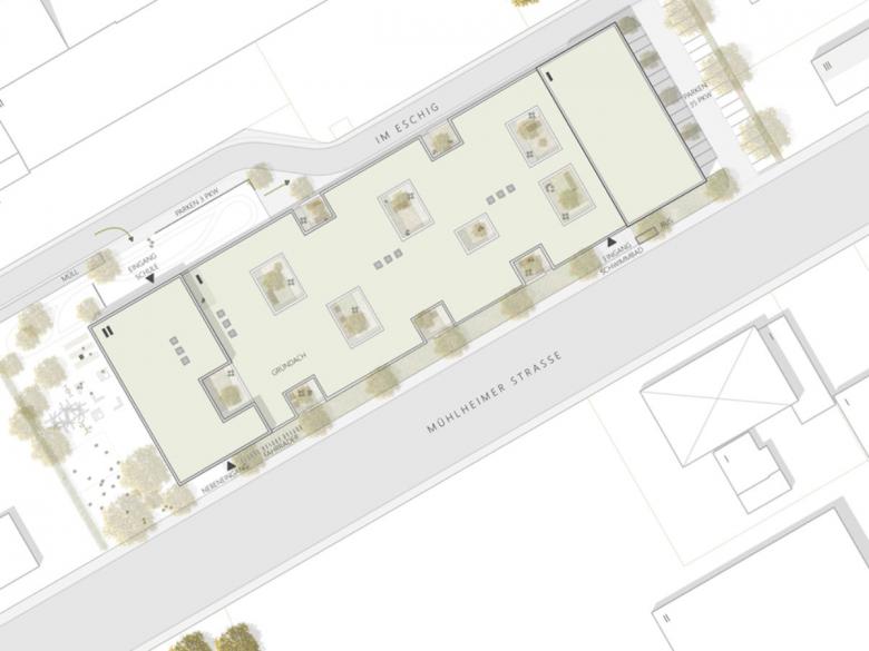 Der Schwimmbadbereich wird für die externe Nutzung direkt von der Mühlheimer Straße, auf der Höhe der Bushaltestelle über einen überdachten Vorbereich erschlossen. unerwünschte Einblicke oder Störungen des Schulbetriebens sind ausgeschlossen.