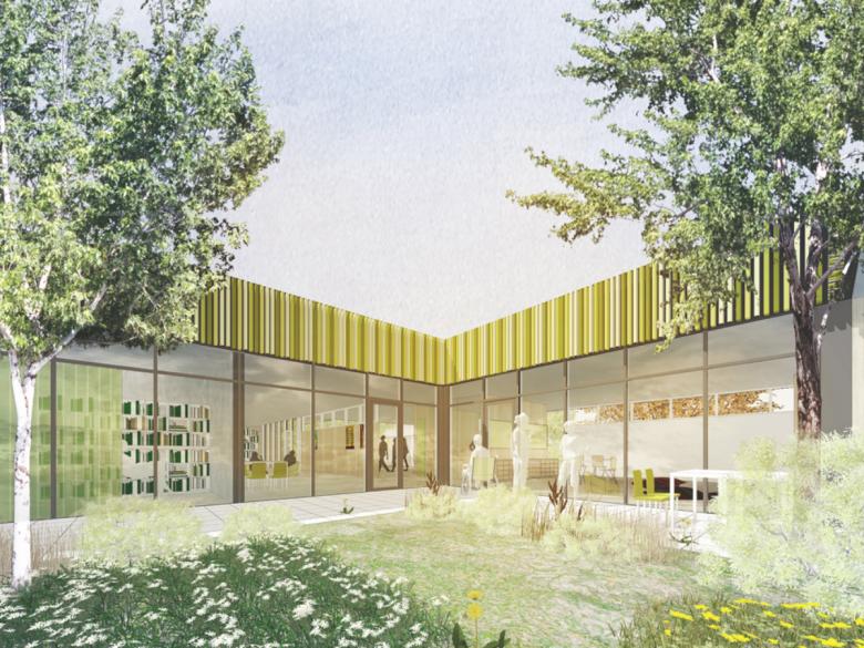 Es entsteht ein großflächiges Erdgeschoss, in dem Innen- und Außenräume pixelartig angeordnet sind. Alle wesentlichen Unterrichtsräume haben einen direkten Bezug zu einem ruhigen Innenhof. der Straßenlärm wird ausgeblendet, Einblicke und Störungen von außen werden minimiert.