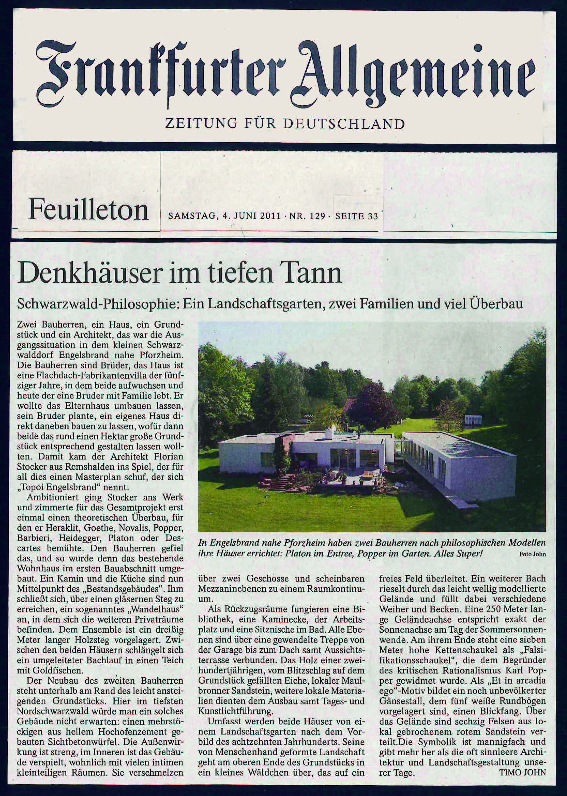 In Engelsbrand im Nordschwarzwald verwandelte der Architekt Florian Stocker aus Remshalden ein weitläufiges Anwesen in einen philosophischen Landschaftsgarten mit bewohnbaren und nicht bewohnbaren Bauten. Während die Sanierung und Erweiterung des Bestandsgebäudes bereits seit 2008 abgeschlossen sind, ergänzt seit Sommer 2009 ein neues Wohnhaus das Ensemble.