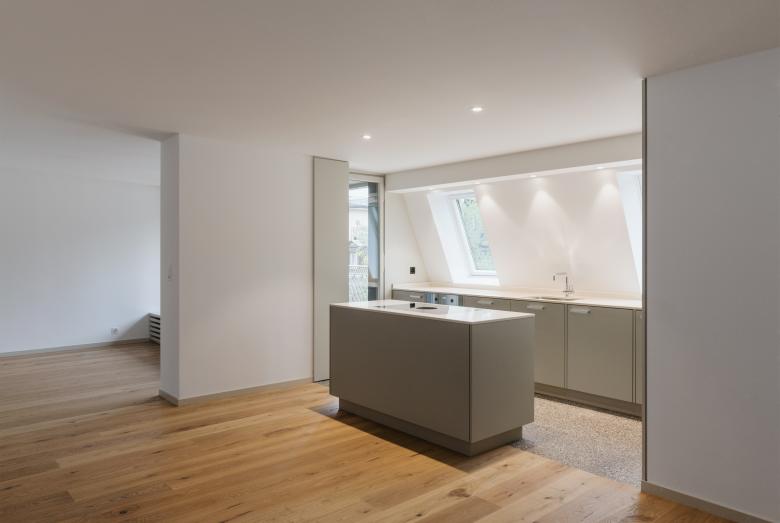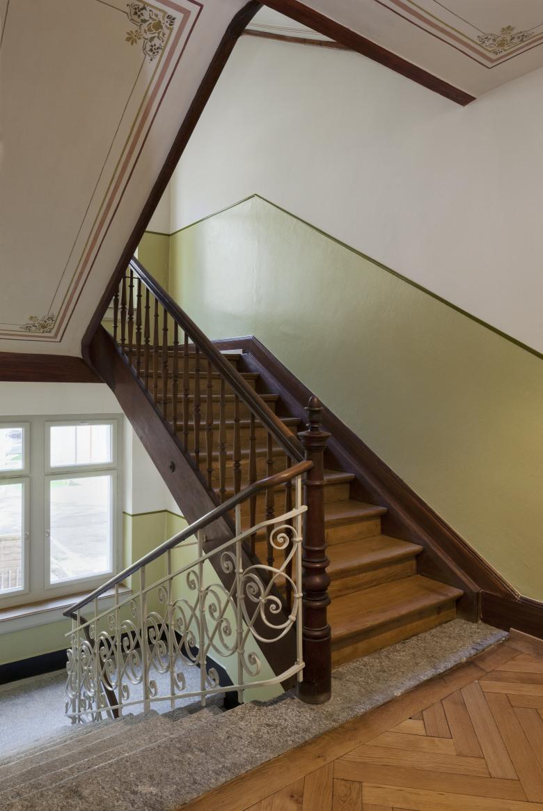 Im Hauseingang zeigt sich mit figürlich geschmückten Terrazzoböden und farbig gefassten Decken ein gewisser Wohlstand der ehemaligen Bewohnerinnen und Bewohner. Diese bauzeitlichen Qualitäten konnten mit angemessenem Aufwand für die kommenden Jahre gesichert werden. Die neuen Wohnungsabschlüsse, die Beleuchtung wie auch die Fenster wurden sorgfältig geplant und ausgeführt. In den Obergeschossen befindet sich je eine Vierzimmerwohnung bei welchen die Küche und die zwei Nasszellen erneuert wurden. Bauzeitliche Ausbauelemente wie Einbauschränke, Brusttäfer und Lambrien wurden instand gesetzt und wo nötig ergänzt, gleiches gilt für die Terrazzo- und Holzböden. Den Wohnungen in Erd- und den Obergeschoss wurde hofseitig ein neuer, detailreich gestalteter Balkonturm vorgestellt. Die bestehende Wohnung im ersten und zweiten Dachgeschoss war von einfachem Ausbaustandard und wurde komplett umgebaut. Anstelle der Grosswohnung wurden zwei Wohnungen als attraktive „Teil-Maisonetten“ entworfen und umgesetzt. Beide Einheiten finden Ihren Zugang im ersten Dachgeschoss und haben über einen zweigeschossigen Treppenkörper einen direkten Zugang zur Dachterrasse.