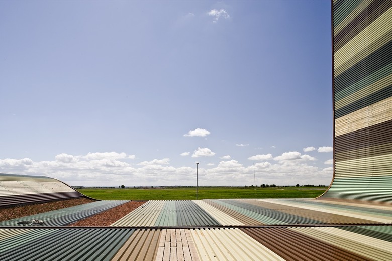 The visual unit of the building is achieved by coating the entire facade with a sheet of metal shades of green, ochre and yellow that contributes to their integration in the surrounding landscape. The deck has vegetative cover cumin with stripes of wood and veneer. This plot emulates the vegetable plot agricultural environment of Lleida.