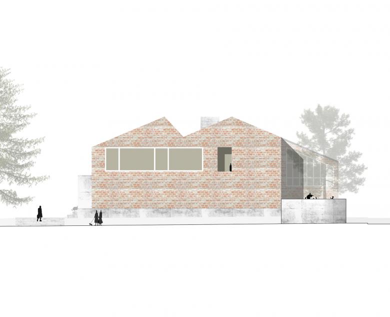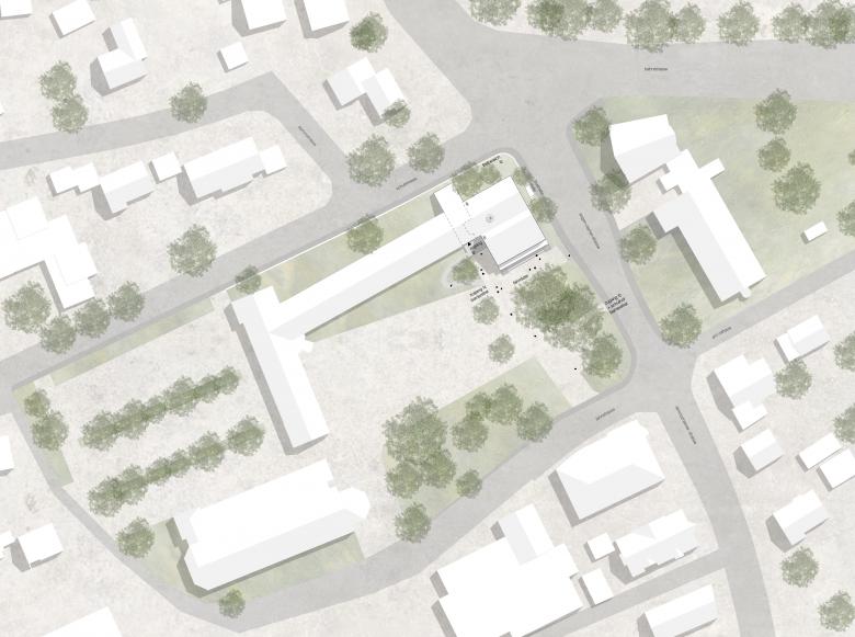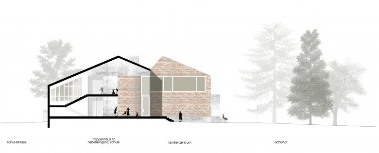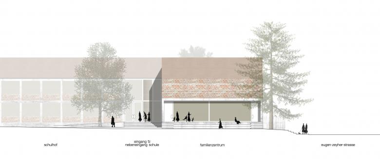 Das neue Familienzentrum nimmt in Verlängerung der Schule deren Proportionen auf. Nach Süden wird der Neubau um eine Einheit mit asymmetrischem Satteldach erweitert. Damit nimmt das Familienzentrum zum einen das Vorhandene seiner Umgebung auf, zum anderen setzt es sich in Materialität und Gestaltung aber auch von ihm ab, und steht so für ein offenes und modernes Haus.