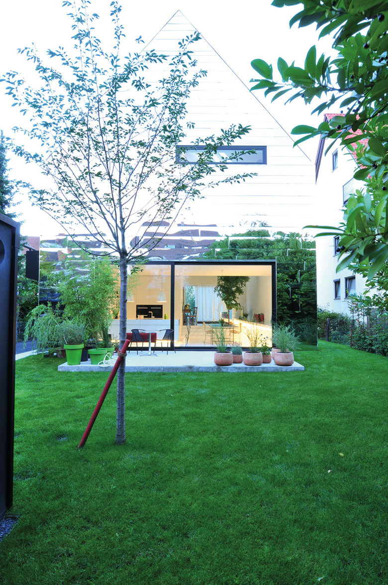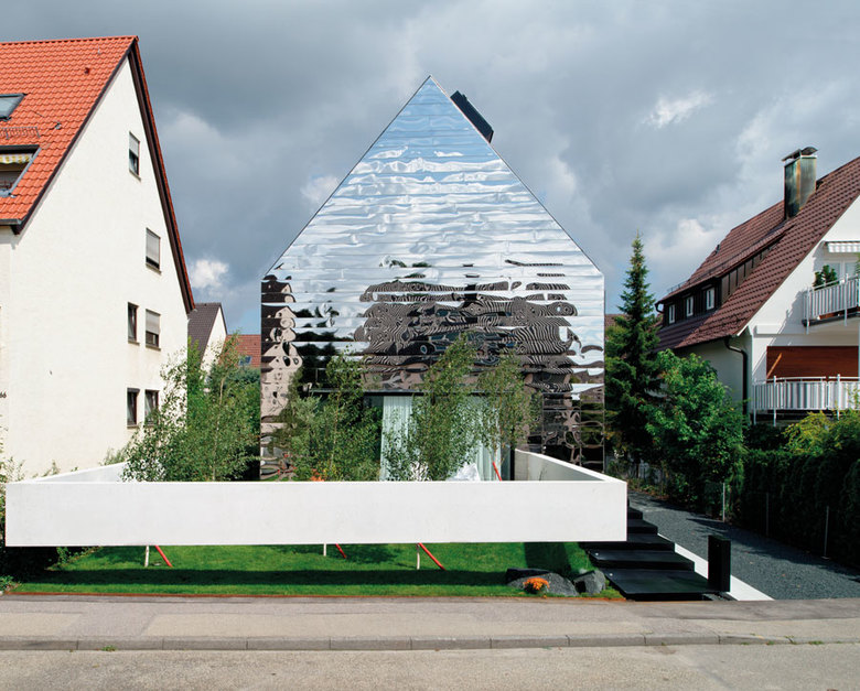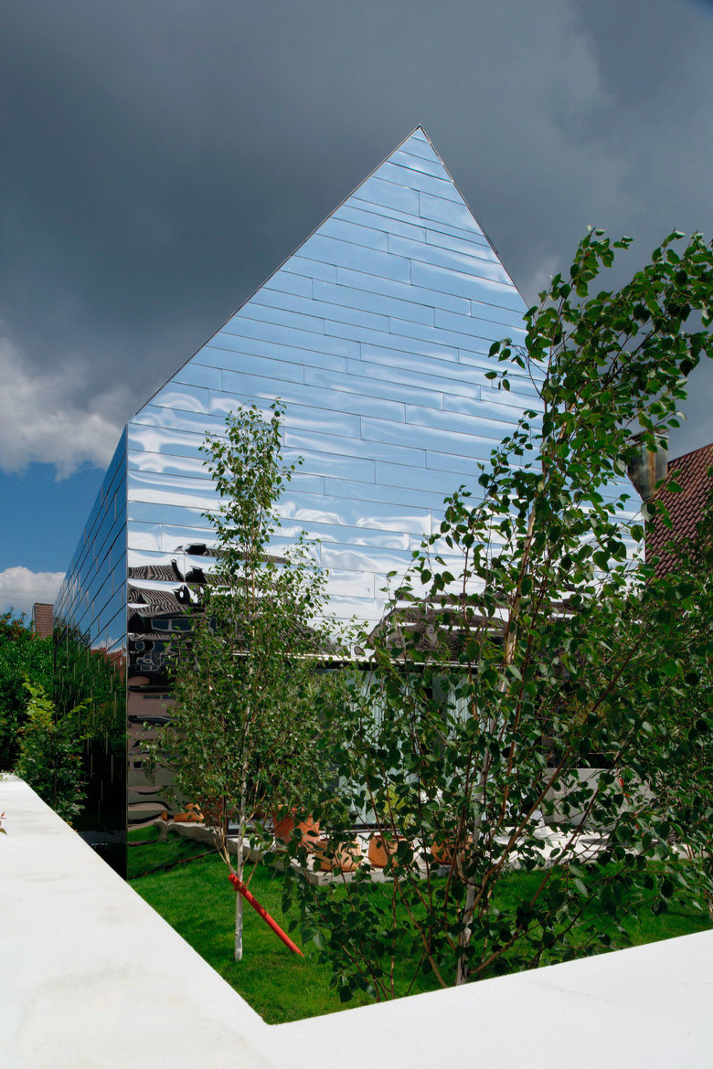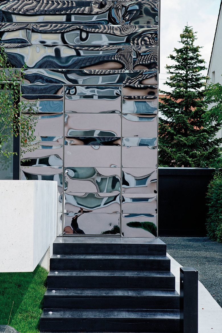 Außen spiegelt die Edelstahlhaut ihre Umgebung wider, will durch Entmaterialisierung quasi in ihr untergehen und sorgt so für eine Anpassung an die vorhandenen Strukturen ohne sich diesen anzubiedern.