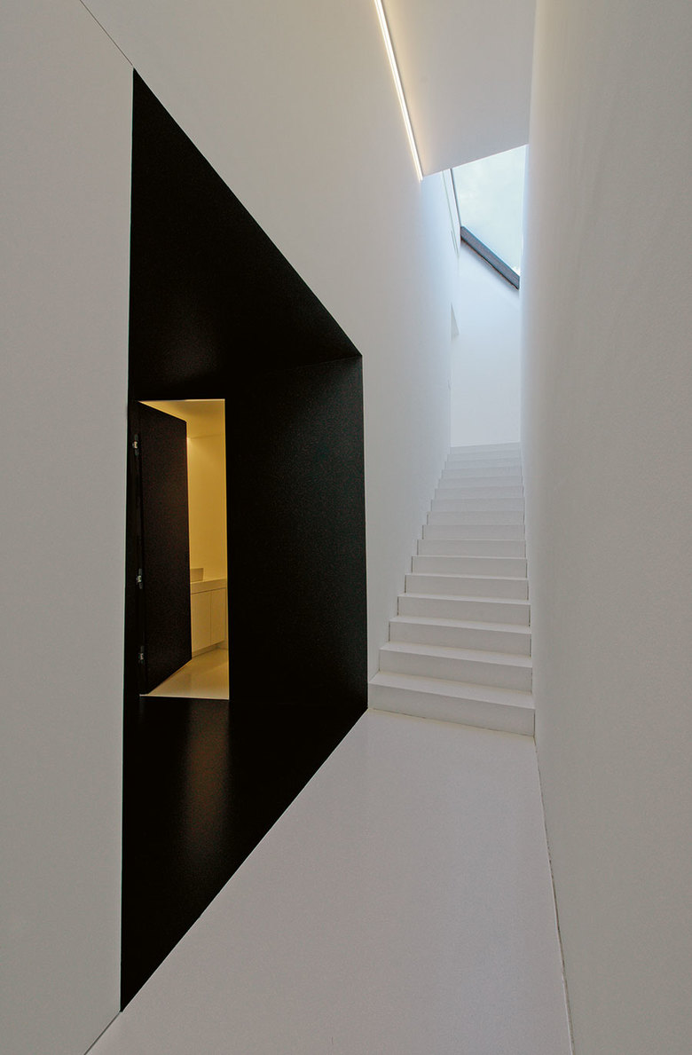 Im Inneren wurde das Haus großflächig entkernt, wodurch Lufträume und Galerien, die die einzelnen Geschosse miteinander verbinden und eine offene Wohnstruktur bilden, entstanden. Bestehende Fensteröffnungen wurden fast vollständig geschlossen und durch neue Fenster unterschiedlichster Größen, Formen und Funktionen ersetzt.