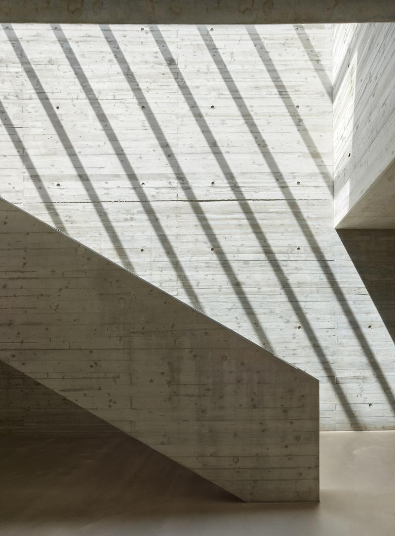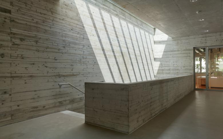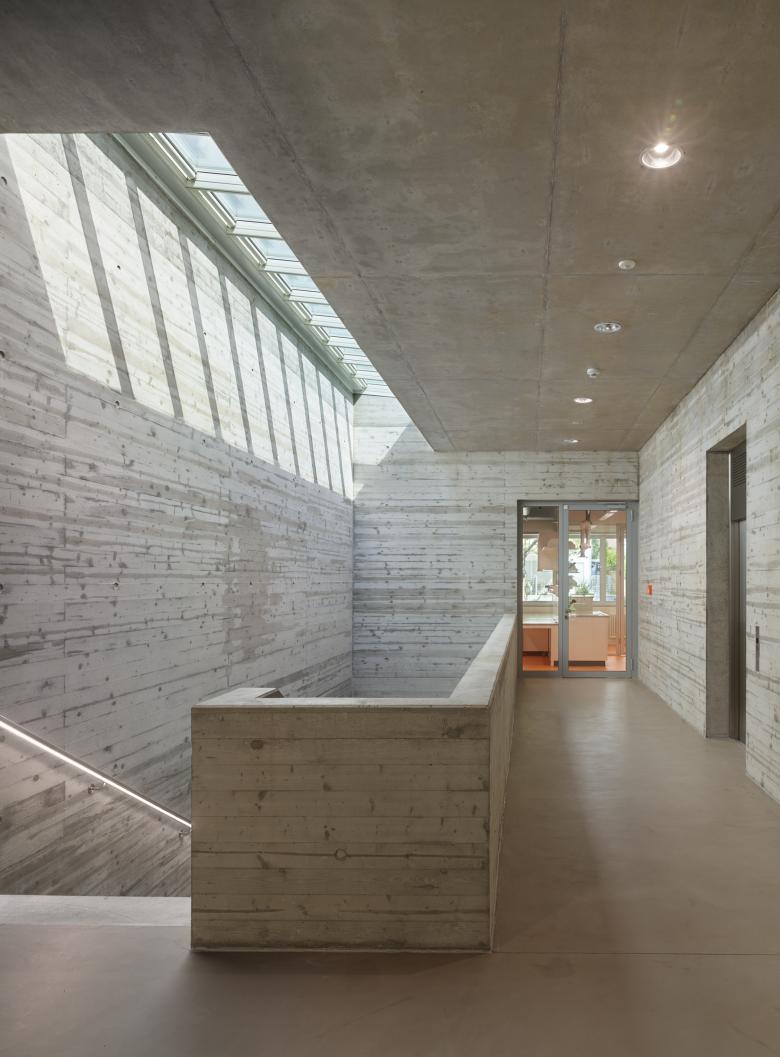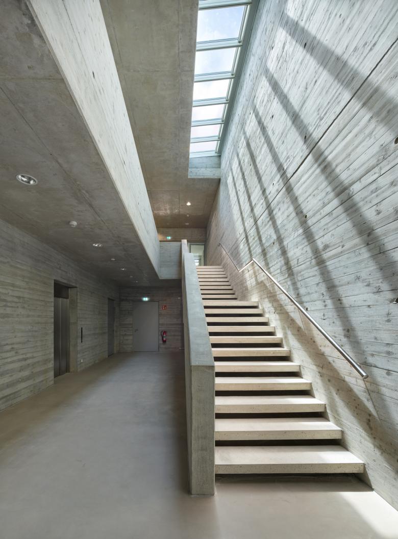 Im Bereich des Foyers ist die Konstruktion durch einen großen Anteil an Sichtbetonflächen erlebbar. Die sich abzeichnende horizontale Bretterschalung greif dabei Thema der Schichtung aus Fassade auf, und überträgt es in den Innenraum.