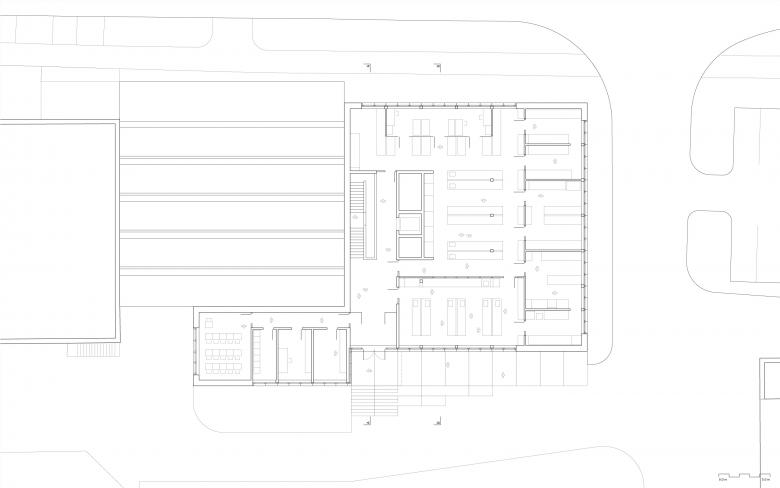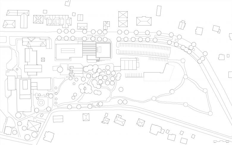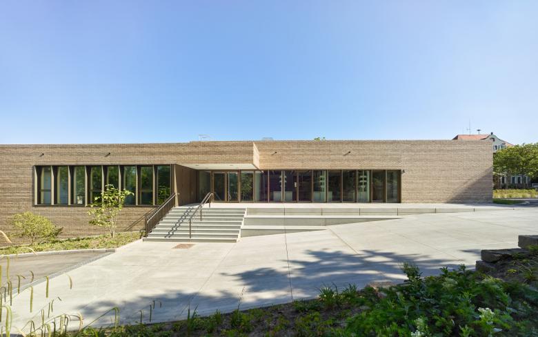 Das architektonische Konzept sieht eine klare Kubatur mit großzügigen Öffnungen vor, wobei sich die einzelnen Nutzungsbereiche in ihrer Höhenentwicklung abzeichnen und somit einen differenzierten Baukörper entstehen lassen. Durch die Verschränkung beider Körper entsteht ein überdachter Eingangsbereich mit vorgelagerter Treppen- und Sitzstufenanlage.
