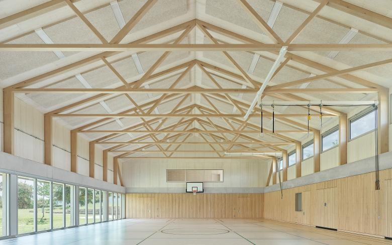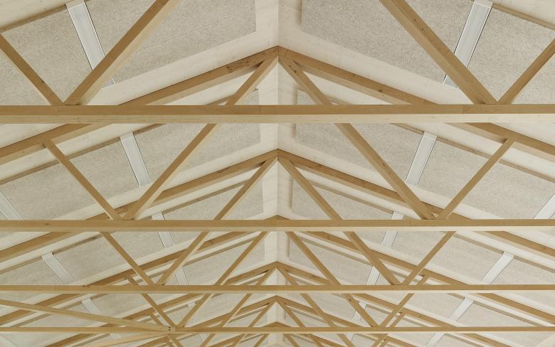 Der Gebäudeentwurf weist eine feingliedrige Struktur im Raster von 2.50 m auf und ist konsequent als konstruktiver Holzbau entwickelt. Die erdberührten und frei bewitterten Bauteile sind dagegen aus Stahlbeton konstruiert. Das filigrane Tragewerk des Hallendachs – 160 Millimeter breite Polonceau-Träger aus Buchenfurnierschichtholz – prägt die Innenraumwirkung maßgeblich.